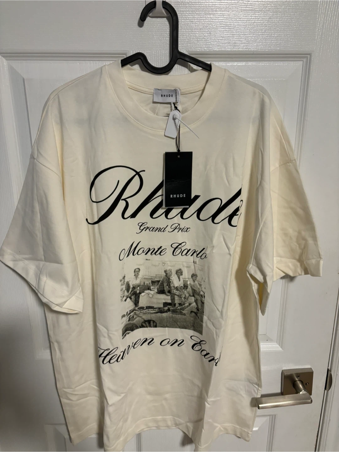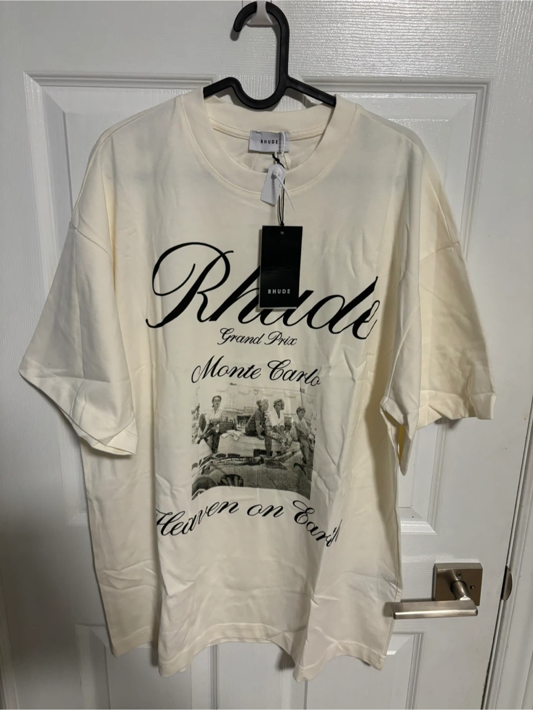 Selling a Rhude Grand Prix Monte Carlo T-shirt in a cream colour. The shirt features a print with the text "Rhude Grand Prix Monte Carlo Heaven on Earth".
