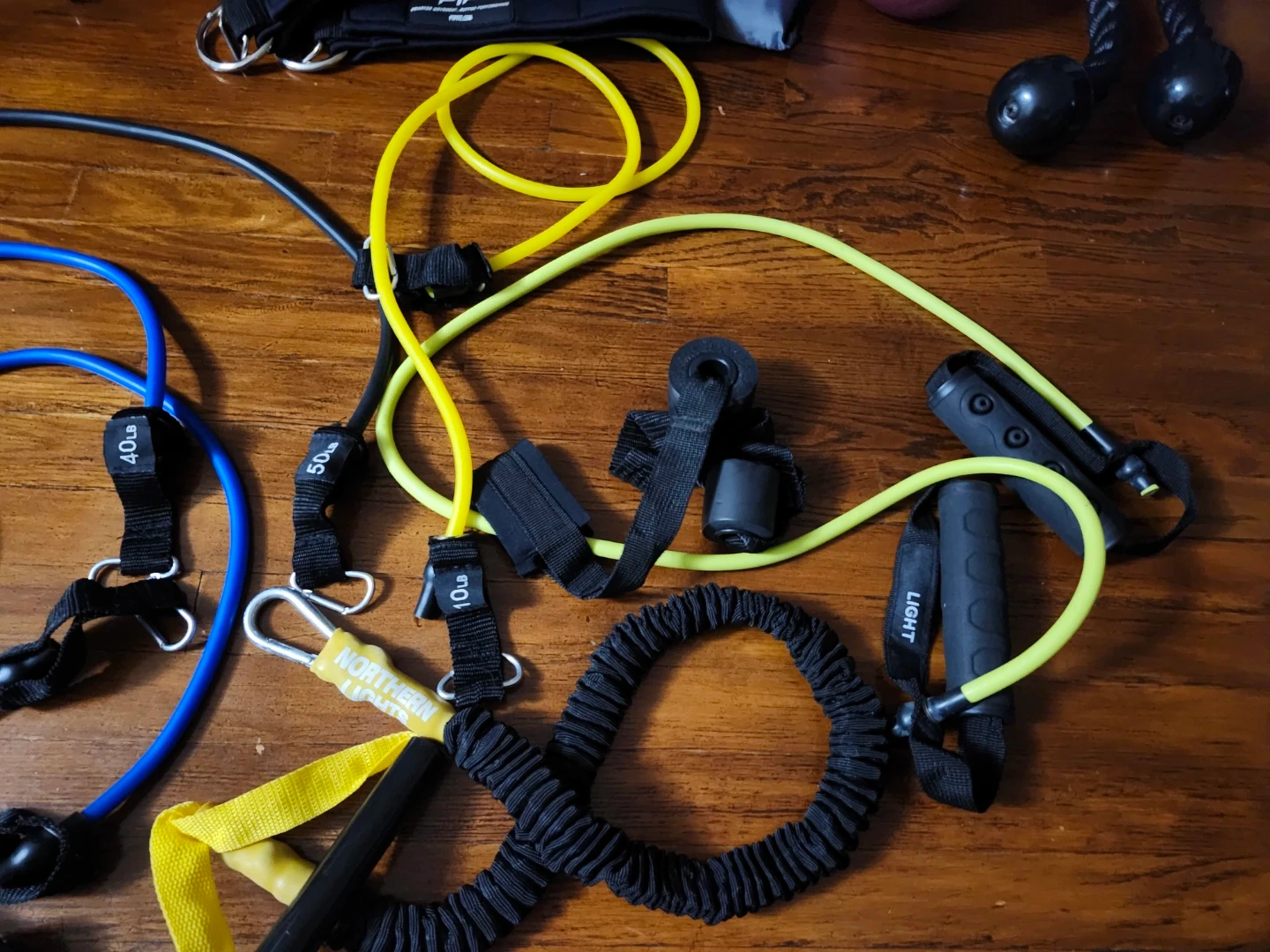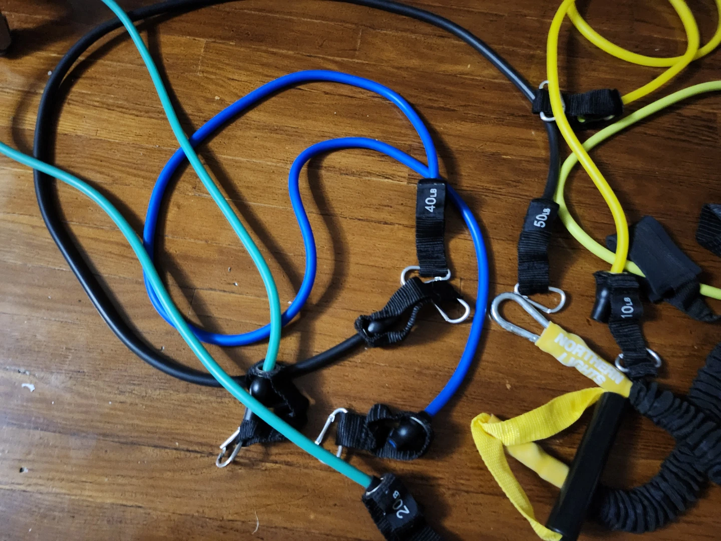 Selling a set of resistance bands, perfect for at-home workouts! The set includes various resistance levels, marked as 10lb, 20lb, 40lb, and 50lb, so you can customize your workout intensity. Great for anyone looking to add some variety to their fitness routine