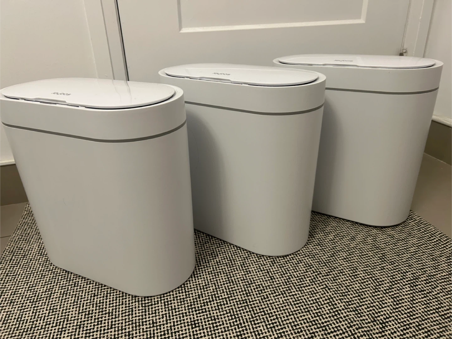 144Selling 3 Joybos automatic trash can! It's super convenient with its automatic lid opening and closing feature. Just press the button, and it's good to go. Perfect for keeping your space tidy and hands-free! Can with Press Top, Small Trash Can Dog Proof, Plastic Trash Bin, Waste Basket for Rv Bathroom Kitchen Bedroom Office White. Trash can size: 2.6 Gallons/9.2 Qt.