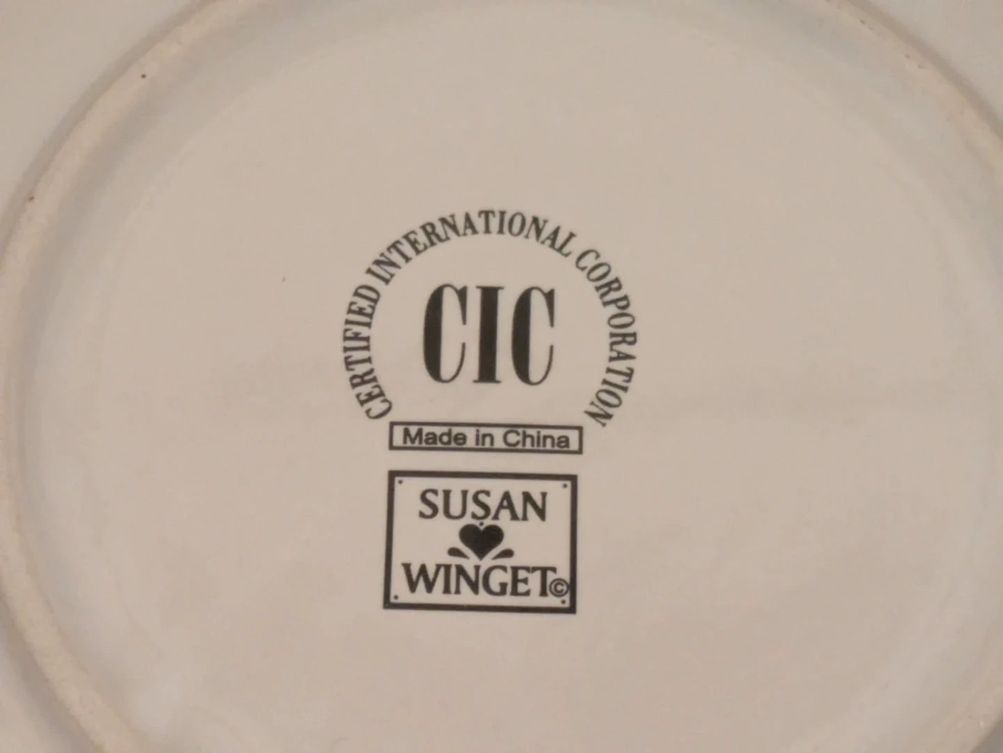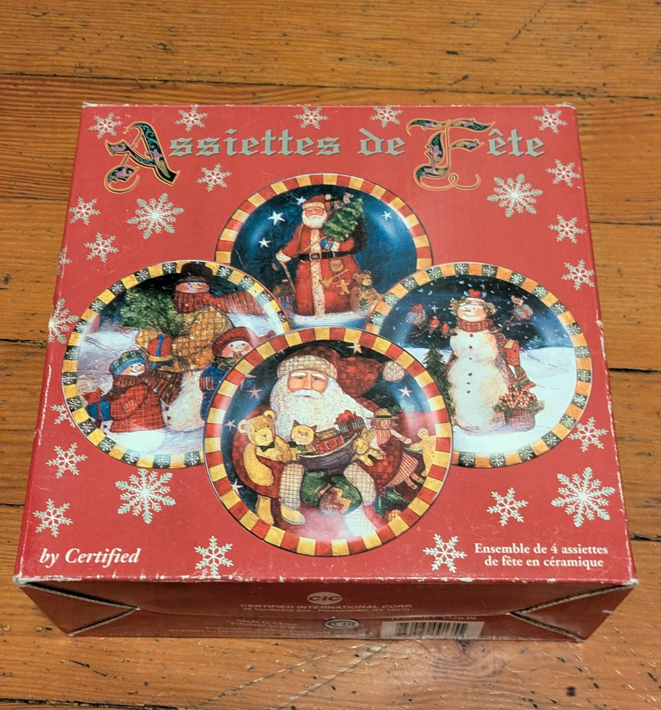 Selling a set of four Christmas plates by Certified International, designed by Susan Winget. These festive ceramic plates feature charming Santa and snowman designs, perfect for adding a touch of holiday cheer to your table. They come in the original box, making them great for storage or gifting!