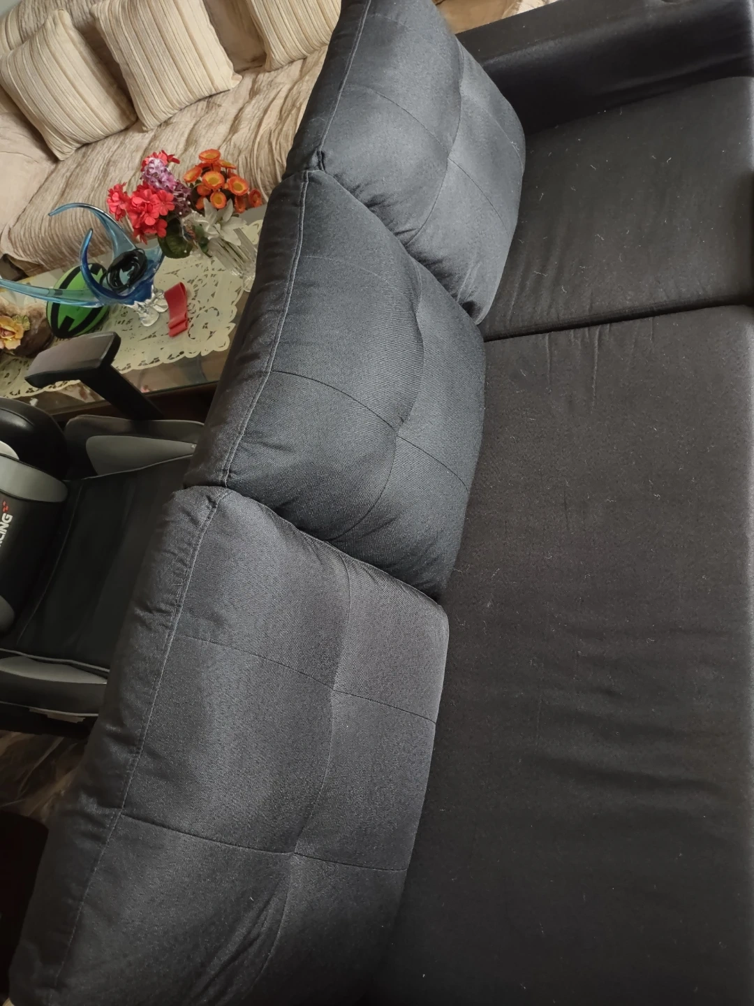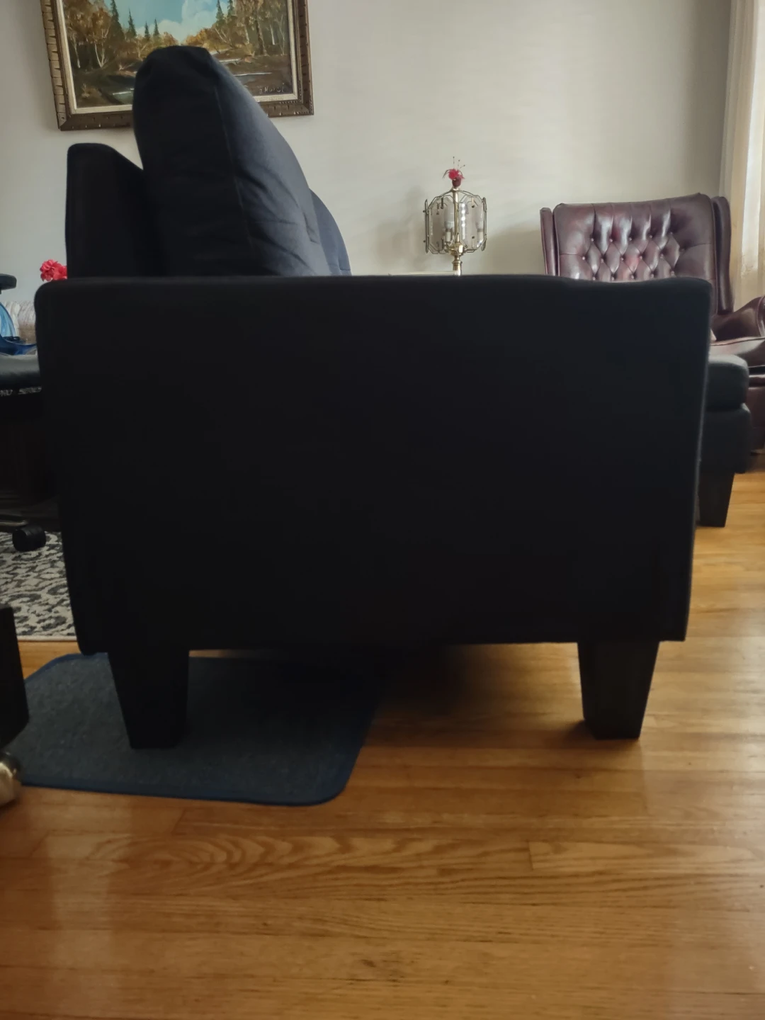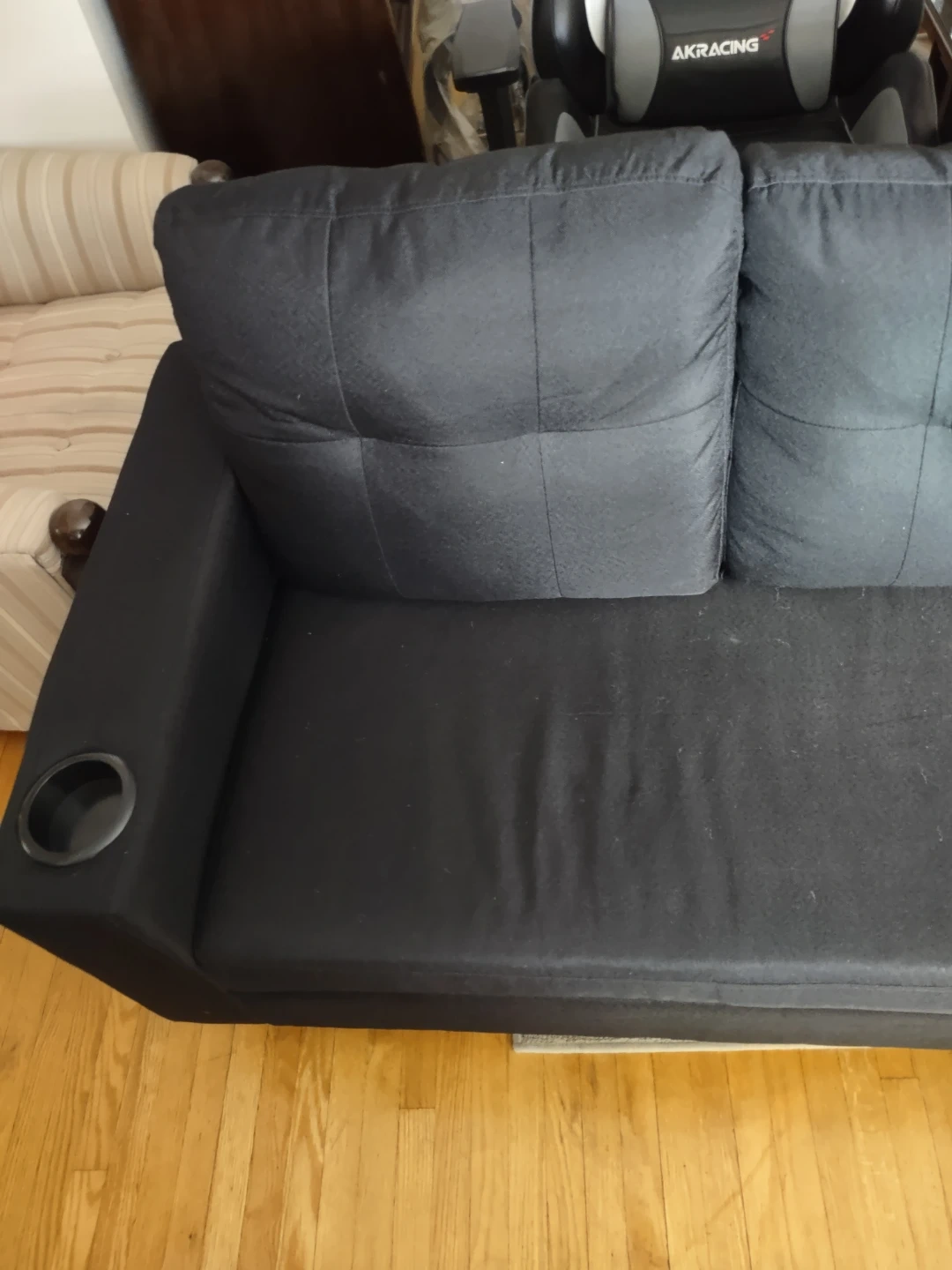 Selling a comfy black sectional sofa! It comes with a matching ottoman, perfect for kicking back and relaxing after a long day. Great for smaller spaces or apartments. It's in good condition and ready for a new home