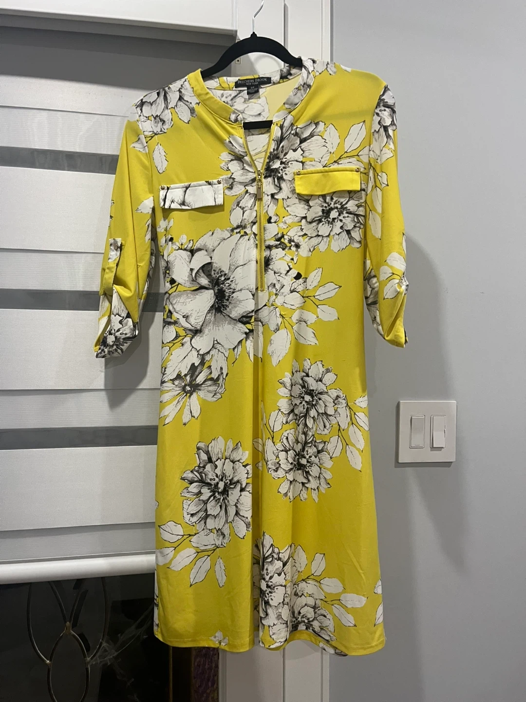 This is a beautiful dress from INC International Concepts! It features a vibrant yellow colour with a striking floral pattern. Perfect for adding a pop of colour to your wardrobe!