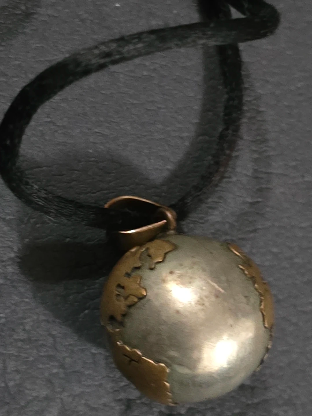 Unique world globe pendant necklace with a black cord. The globe has a silver and gold finish, showing the continents. It's in good condition and ready to be worn!