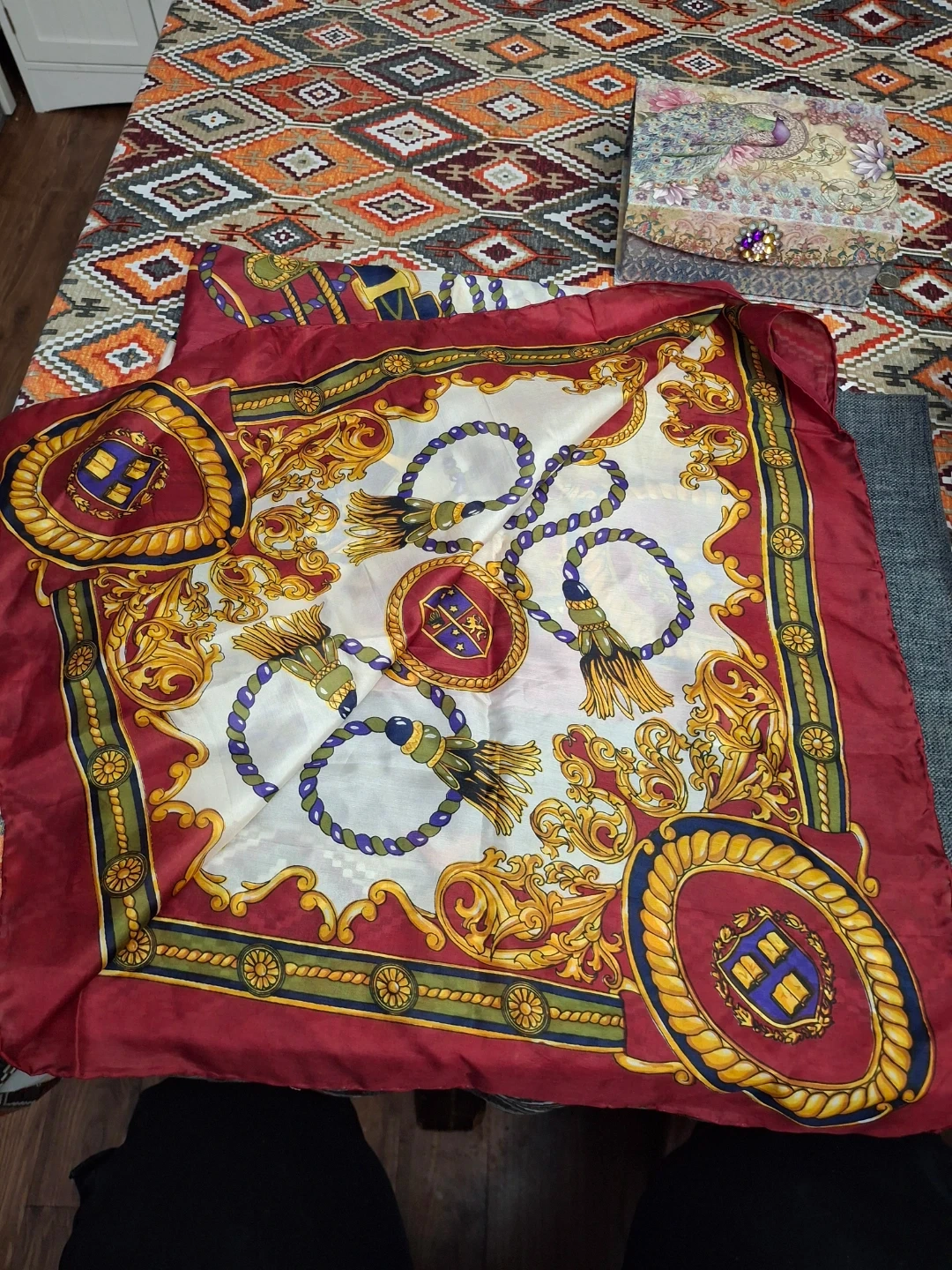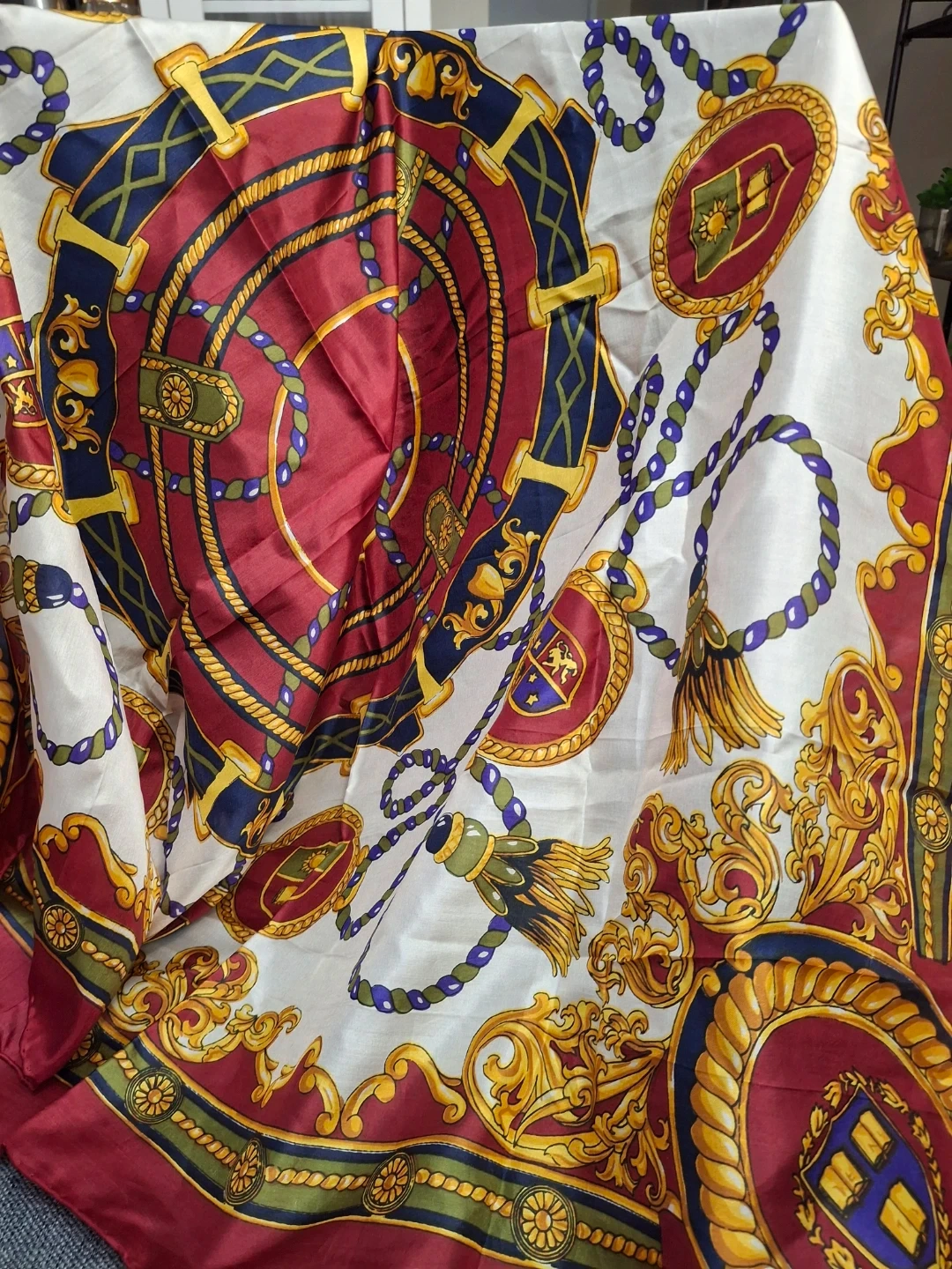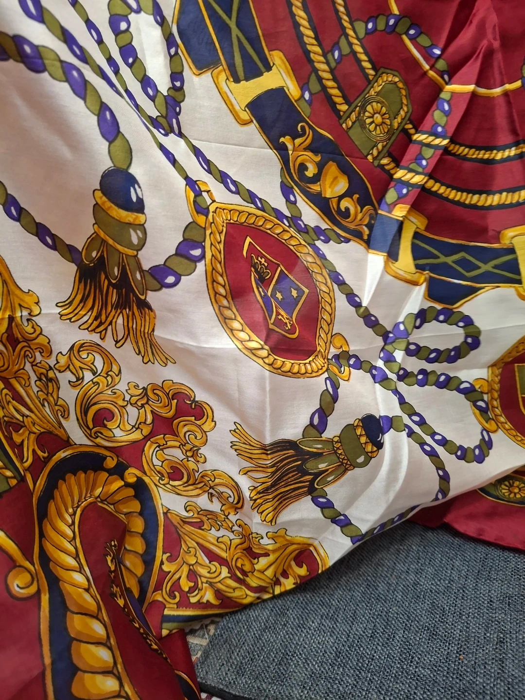 15A vintage-style scarf with a unique design! It features a mix of red, white, and gold colours with ornate details and patterns. Perfect for adding a touch of elegance to any outfit