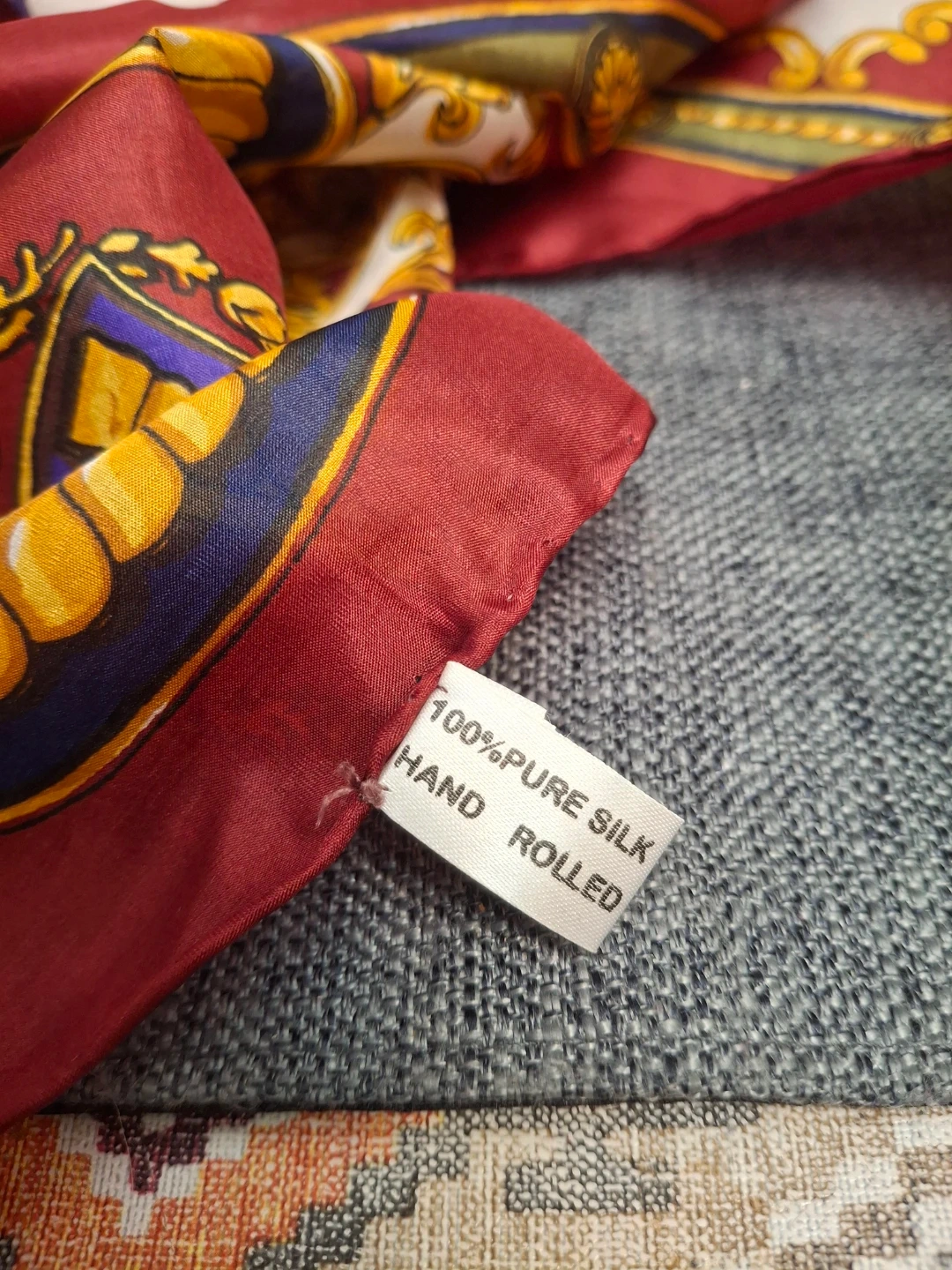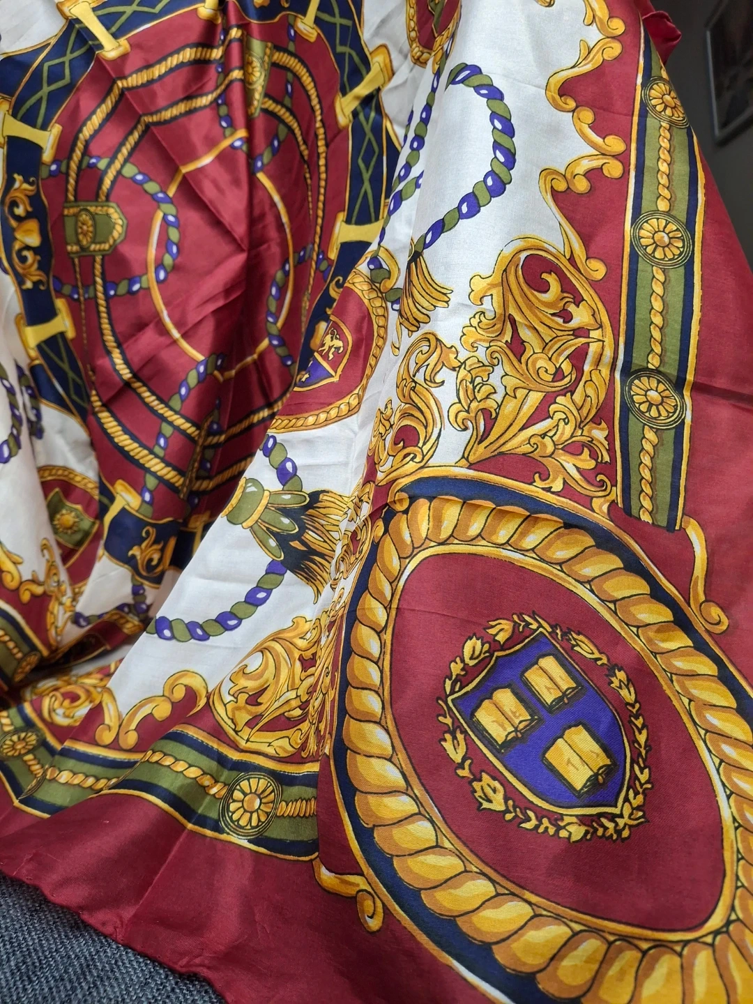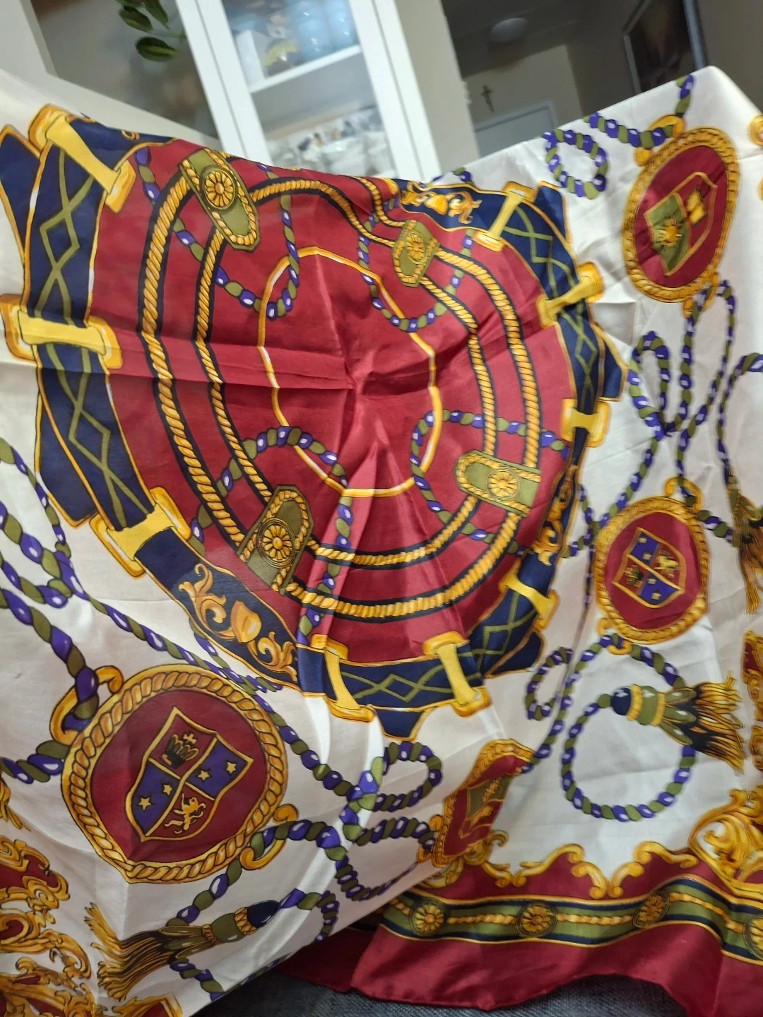 15A vintage-style scarf with a unique design! It features a mix of red, white, and gold colours with ornate details and patterns. Perfect for adding a touch of elegance to any outfit