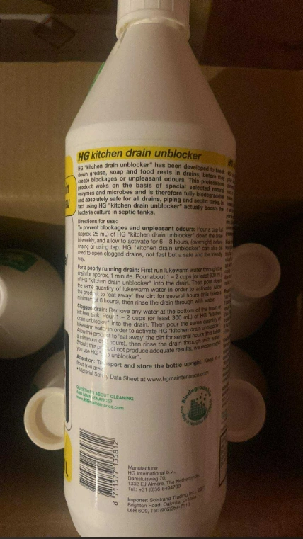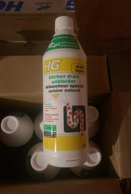 10Brand New Sealed HG Kitchen Drain Unblocker/Unclogger/Cleaners 1L Bottles. Effective Natural Sink Unblocker - For Persistent Blockages. Works While You Sleep! Professional Enzyme Formula. Biodegradable. $15 Each. 6 Bottles in Each Box. $80 Per Box. Buy Bulk Boxes for an even better deal!