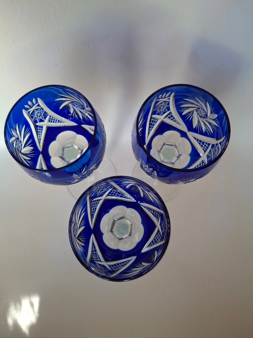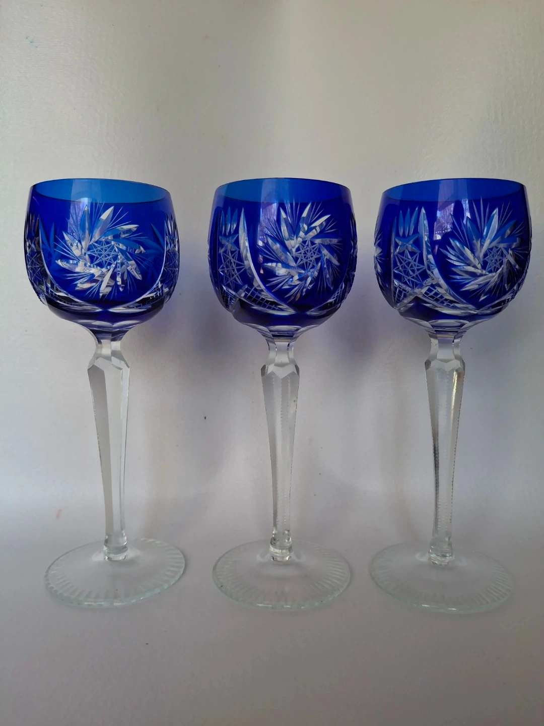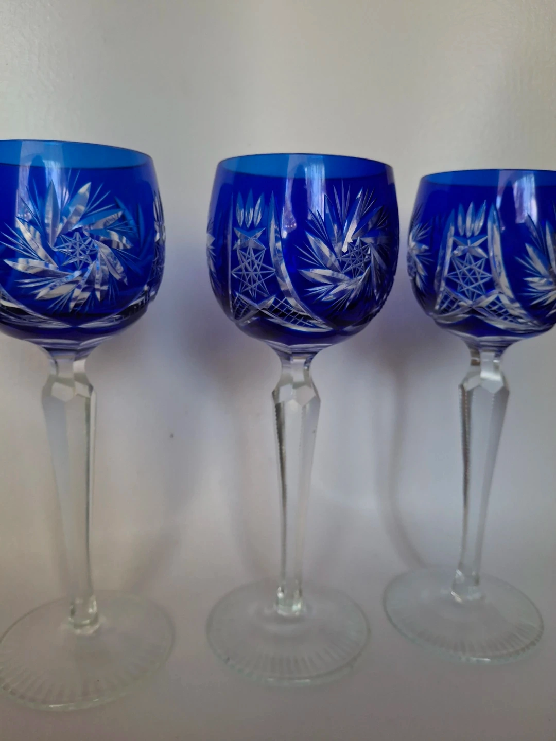 Selling a set of three beautiful blue crystal wine glasses. They have a lovely cut crystal design and would be perfect for special occasions or to add a touch of elegance to your dining table