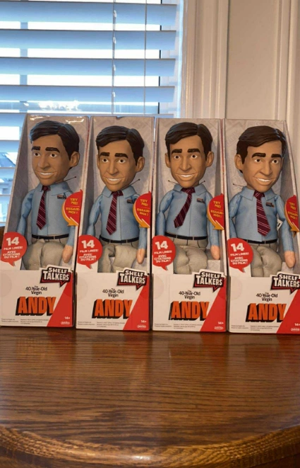 10Brand New In Box Shelf Talkers 12" Talking Plush Andy from The 40-Year-Old Virgin - Pull String Toy Collectible Plush. -Pull the string to activate 14 lines from the movie The 40-Year-Old Virgin for memorable lines like “Is it true that if you don’t use it you lose it?”, “Hope you have a big trunk because I'm putting my bike in it”, and “Oh, that tasted like shellfish” plus many more! -Open up Andy’s shirt to reveal a surprise moment from the film Shelf Talkers - Andy is approximately 12 inches in height *Includes 3x replaceable LR44 Batteries Makes a great gift for any fan all year long! 4 Available. $30 Each.