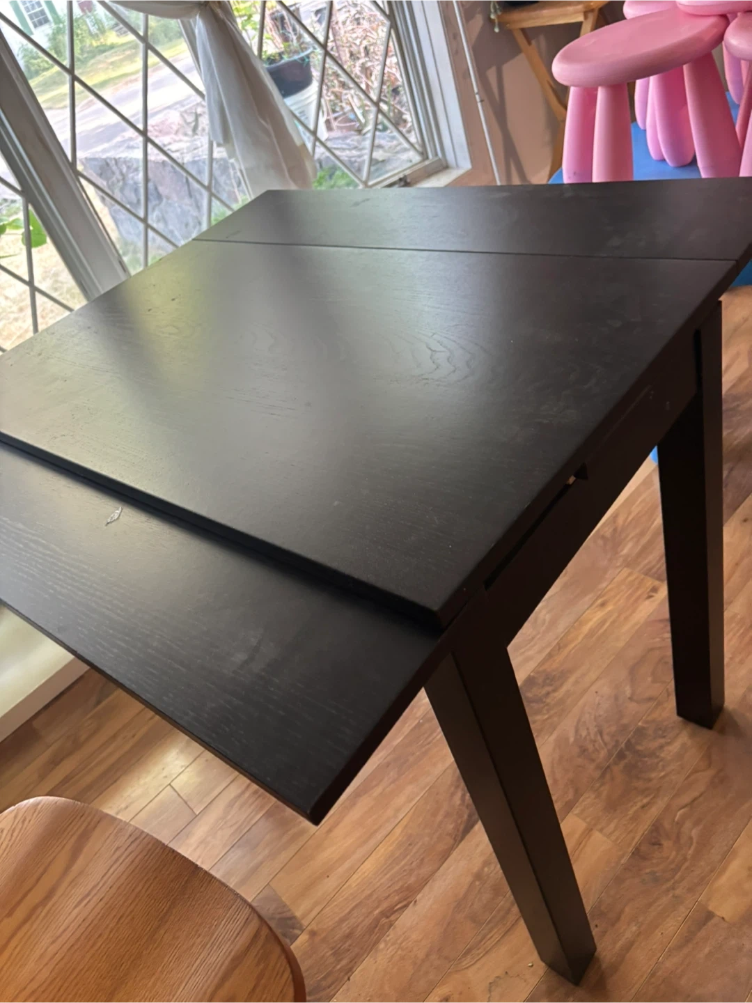 Selling a black extendable dining table. It's in good condition and perfect for smaller spaces that need flexibility. The extension mechanism works smoothly, making it easy to adjust the table size as needed. Great for apartments or dining nooks!