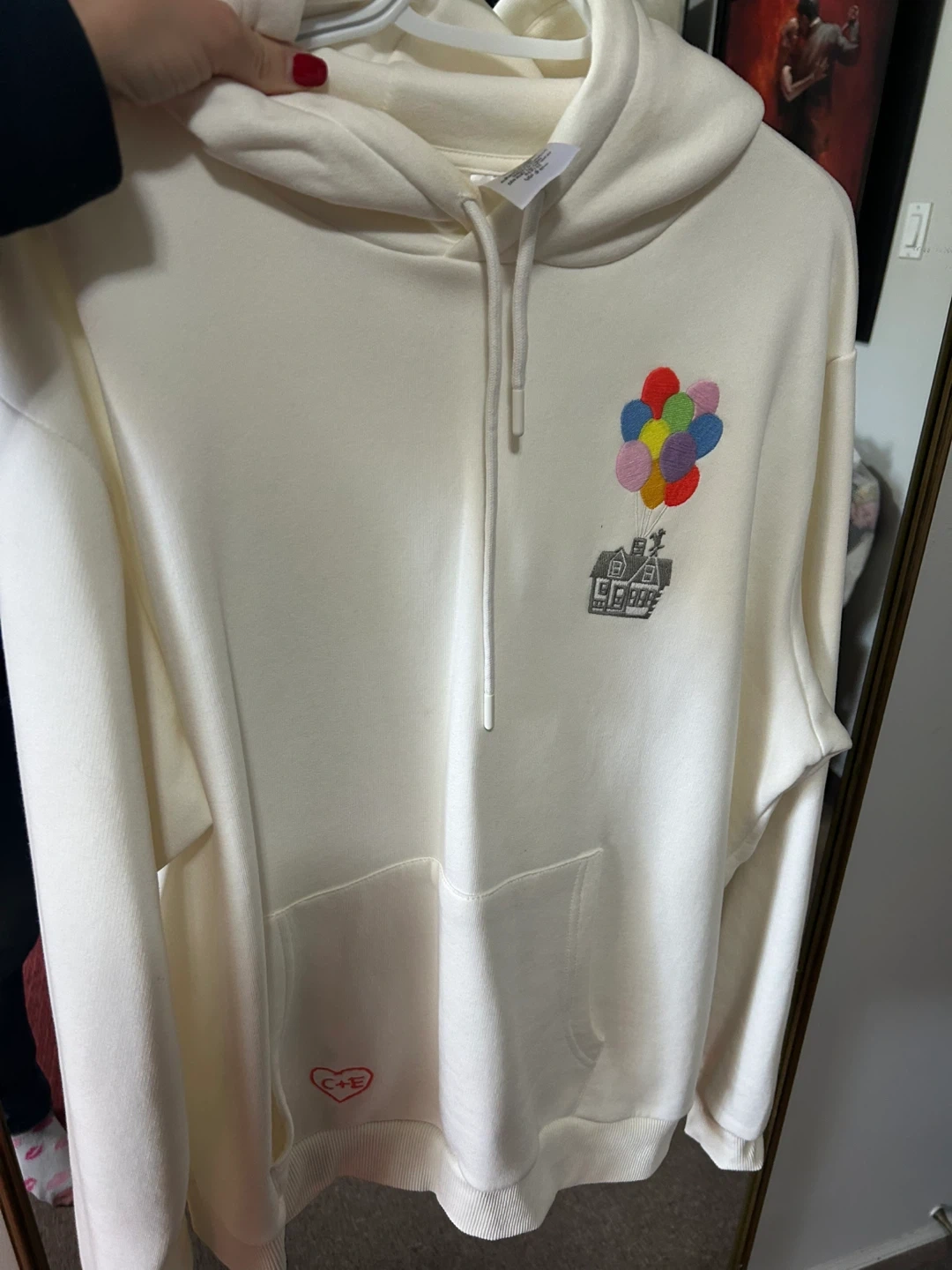 Cozy cream-coloured Disney Pixar UP hoodie! Features a cute embroidered design with the house from the movie and a heart detail on the pocket. Size L.