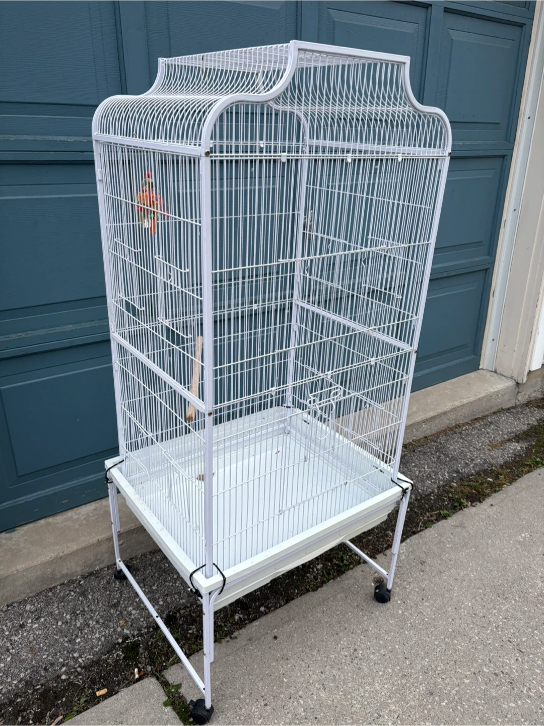 Selling a white bird cage that comes with its own stand on wheels. It's in good condition and ready for a new feathered friend!