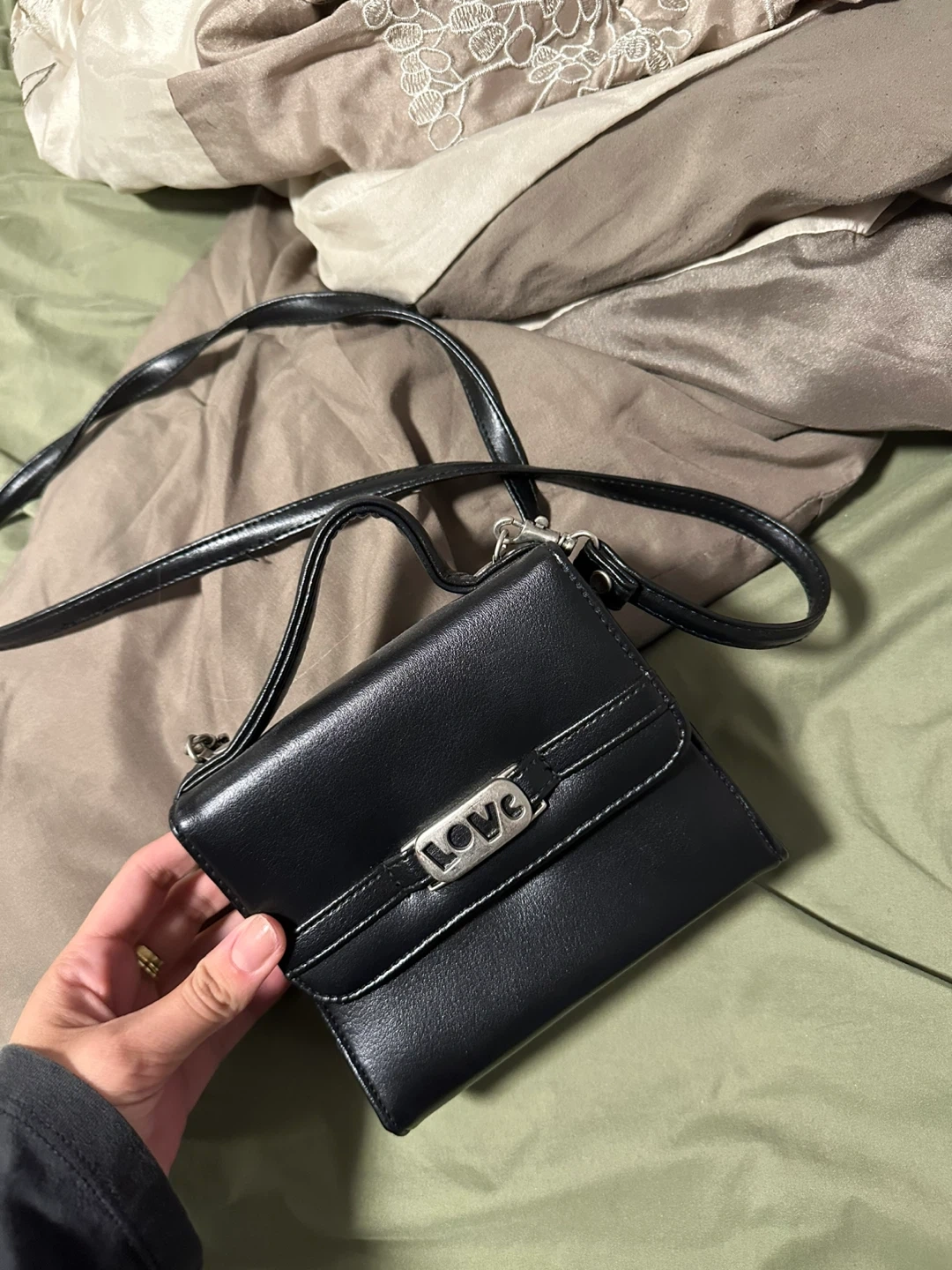 Cute black handbag with 'love' on the front! It's in great condition and perfect for a night out or just running errands around town