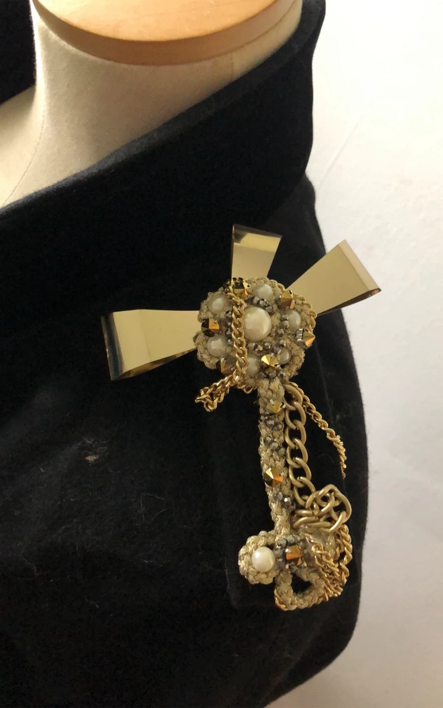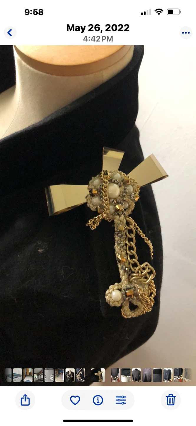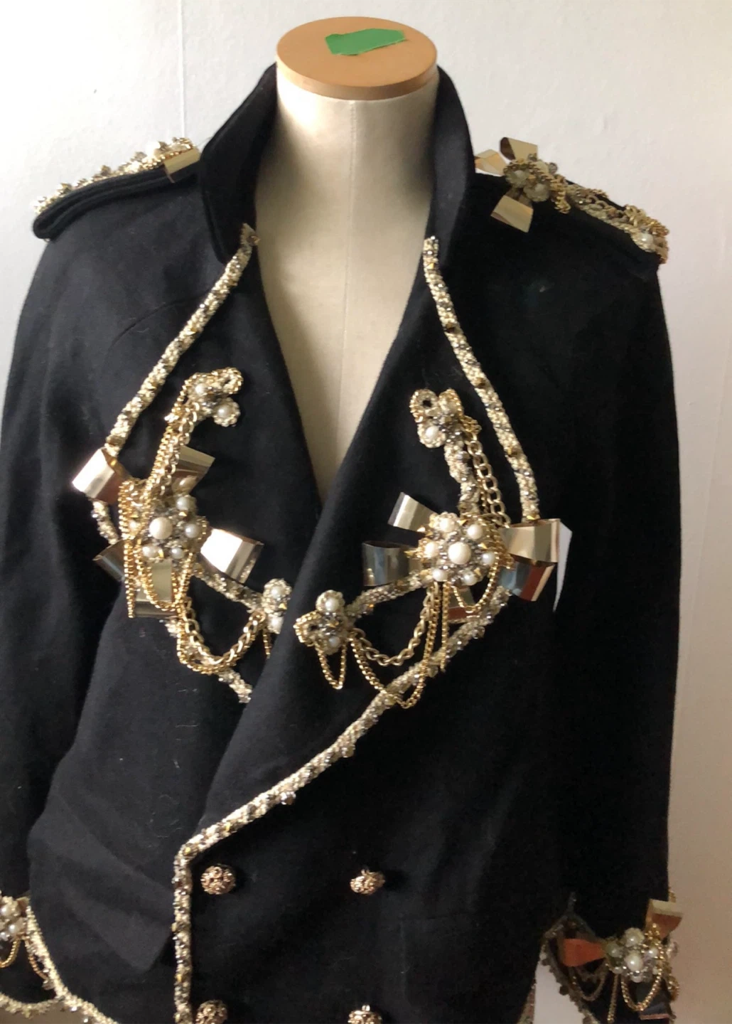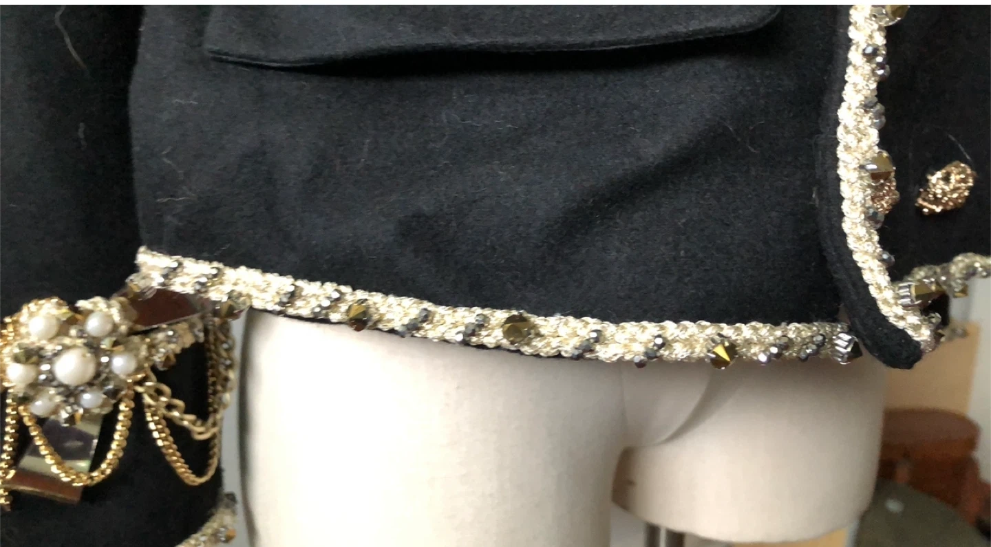 Here's a unique black jacket with a military-inspired design! It features beautiful gold embellishments, including chains and pearl-like accents. Perfect for adding a statement piece to your wardrobe!