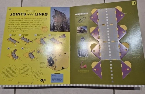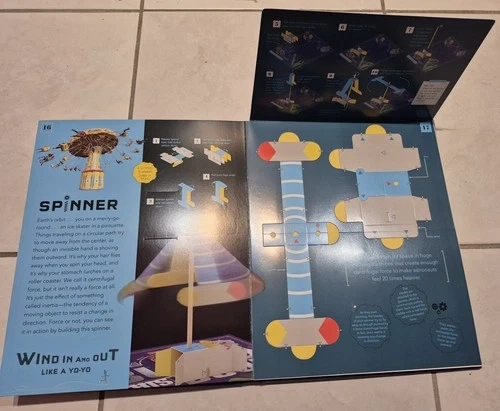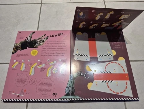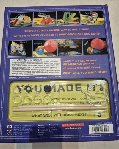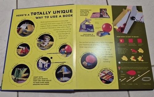 103For budding engineers or physicists. Build simple machines and learn how they work. Suitable for ages 8 and up. NOTE: Book is missing cardboard pieces on pages 5, 19 and 21. See photos. Some of the building items are missing and you can use your own: balloon, soft washers, extra string. Great for a resourceful child who will take the extra challenge of tracing out new cardboard pieces using the book templates.