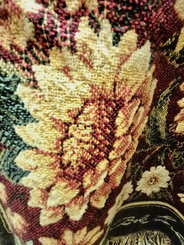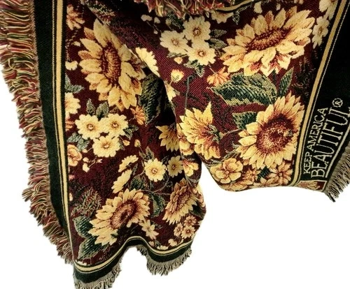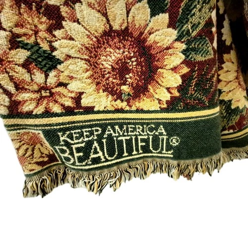 Vintage Bob Timberlake™ woven tapestry featuring vibrant sunflowers and the iconic ‘Keep America Beautiful®’ message.