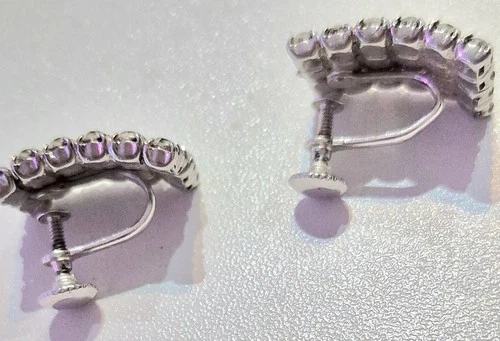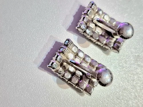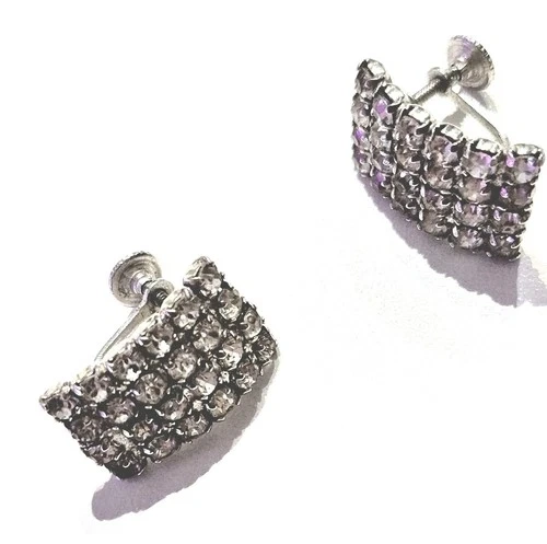 103Channel timeless elegance with these vintage rhinestone earrings, featuring a dazzling grid of 24 clear stones per earring in a sleek rectangular setting. The screw-back design offers secure, adjustable comfort—no pierced ears required. Perfect for collectors, stylists, or anyone chasing retro sparkle. - Style: Rectangular grid with 24 rhinestones per earring - Backing: Screw-back (secure and adjustable) - Era: 1950s cocktail/ Art Deco revival - Condition: Excellent – no missing stones, hardware functions smoothly - Finish: Silver-tone metal with bright, clear stones Why You'll Love Them: - Authentic vintage charm with bold sparkle - Ideal for bridal styling, retro fashion, or costume design - Comfortable screw-back fit—classic and practical