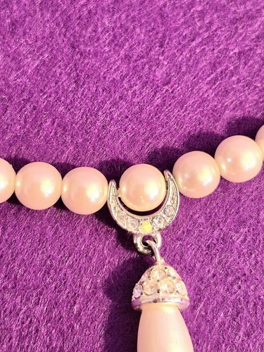 This beautifully crafted necklace features a strand of luminous faux pearls, and a silver-tone crescent moon pendant adorned with sparkling rhinestones, cradling a single pearl and finished with a teardrop pearl drop. The adjustable clasp ensures a comfortable fit for any neckline.