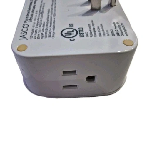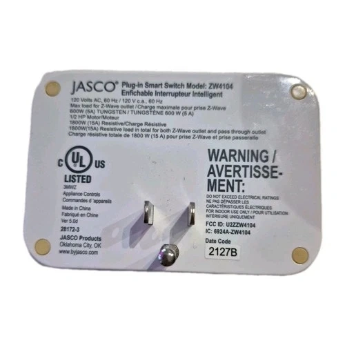 103The Jasco ZW4104 is a Z-Wave Plus plug-in dual-outlet switch with one Z-Wave controlled outlet and one pass-through outlet. Its specifications include a power rating of Power: 120VAC, 60Hz Signal Frequency: 908.4/916MHz Maximum Load (Both Outlets): 1800W 15A resistive Maximum Load (Z-Wave Controlled Outlet): 600W 5A incandescent 1/2HP motor 1800W resistive Wireless Range: Up to 150 feet line of sight Operating Temperature: 32−104°F 0−40°C Z-Wave Version: Z-Wave Plus with S2 Security and SmartStart Wire Requirement: Neutral wire is required for in-wall models, but the ZW4104 is a plug-in unit. Installation: For indoor use only