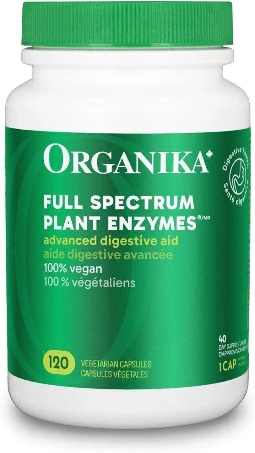 Selling a bottle of Organika Full Spectrum Plant Enzymes. This advanced digestive aid contains 120 vegetarian capsules, perfect for a 40-day supply. It's 100% vegan!