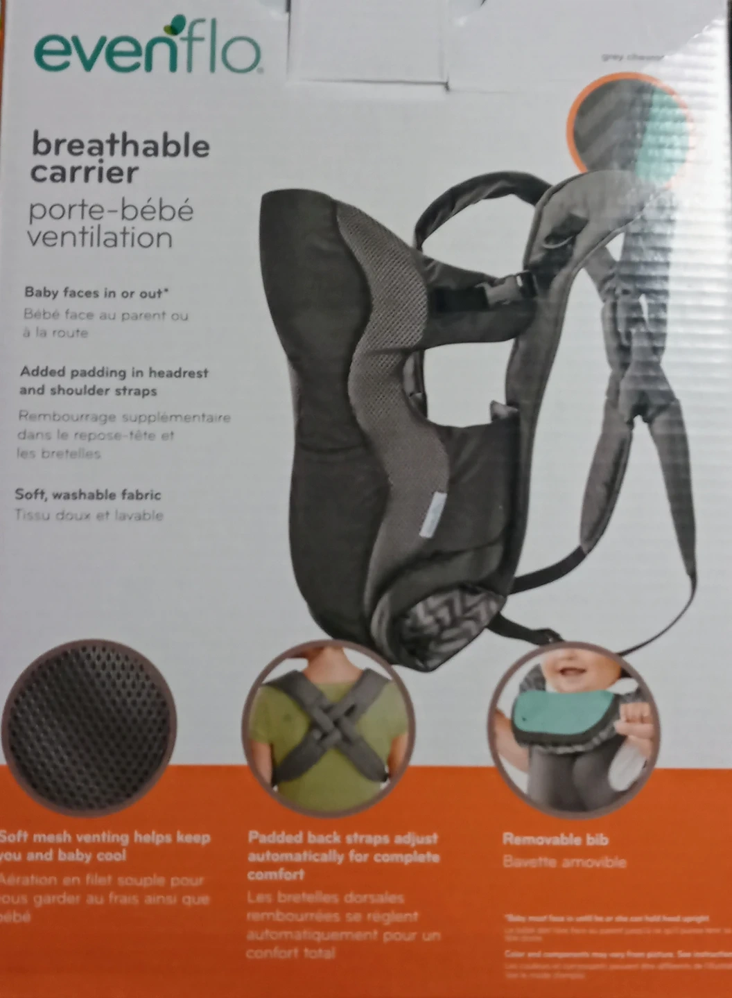 2 carrying positions- (baby can face in or out), Breathable mesh material provides comfort for adult and baby, 1 Removable bib