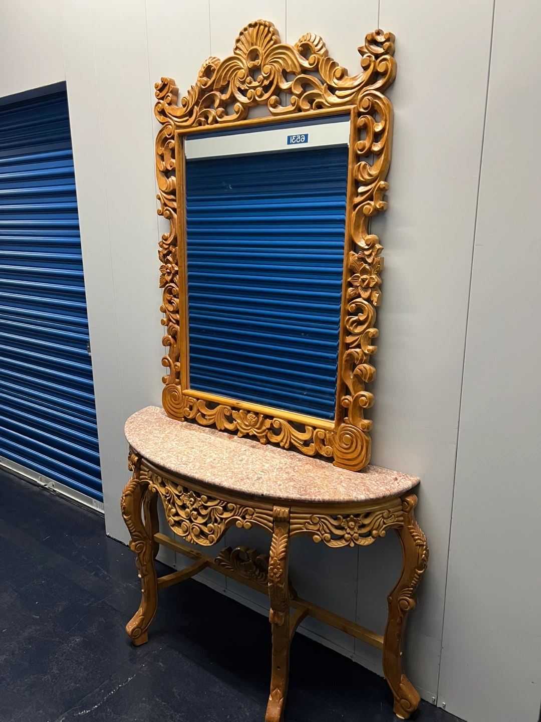 Beautiful ornate wood mirror and marble top console table. It features intricate carvings and a unique design. Would look great in an entryway or living room!