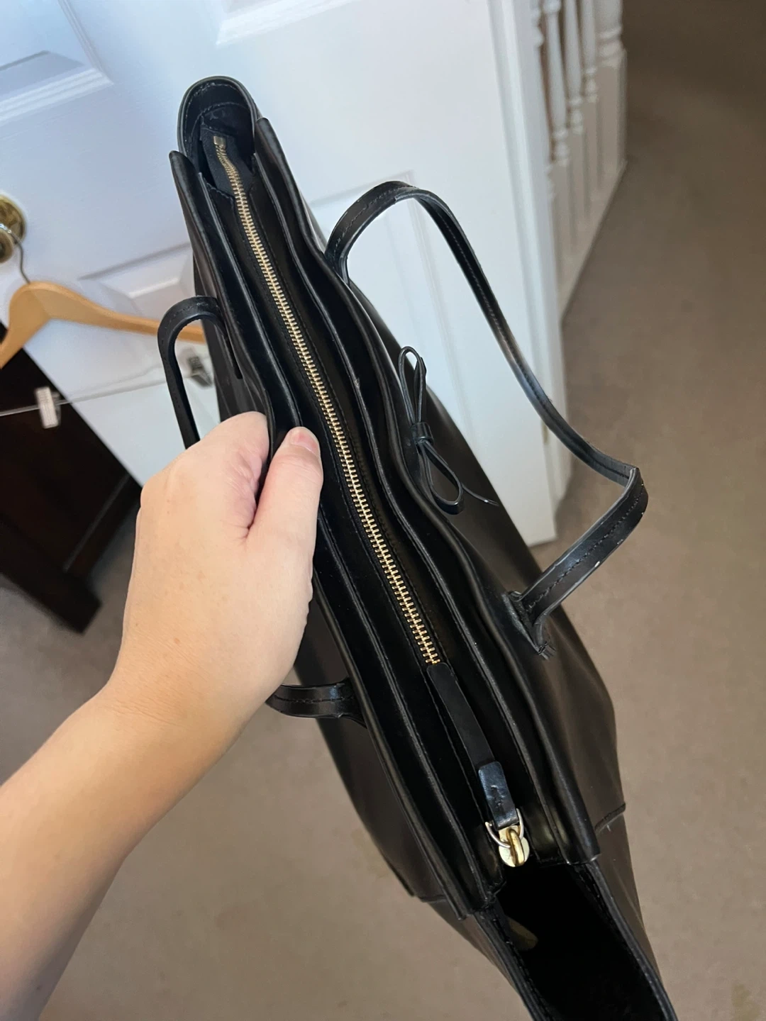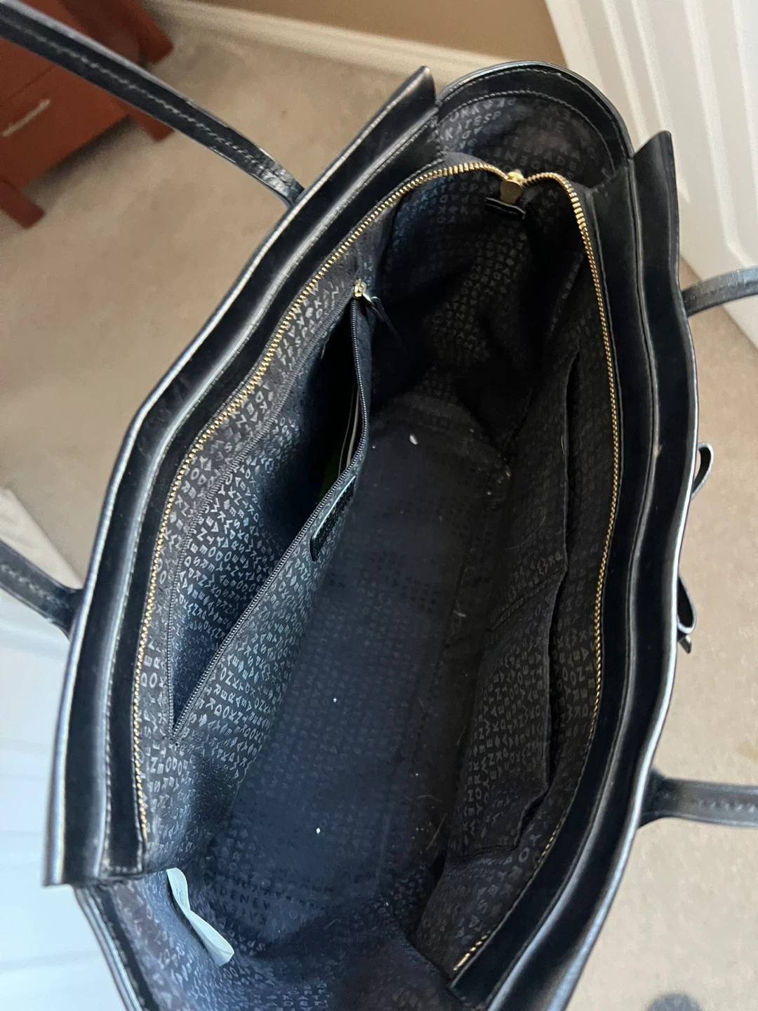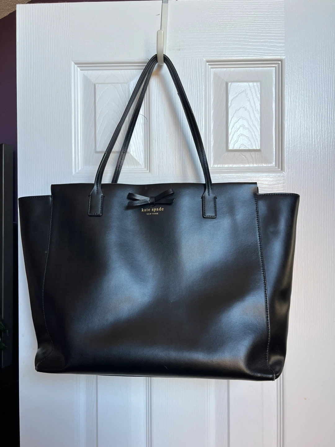 86Selling a Kate Spade black tote bag. It's in great condition and perfect for everyday use! The interior lining features the Kate Spade logo pattern. It has a zipper closure and a bow detail on the front.