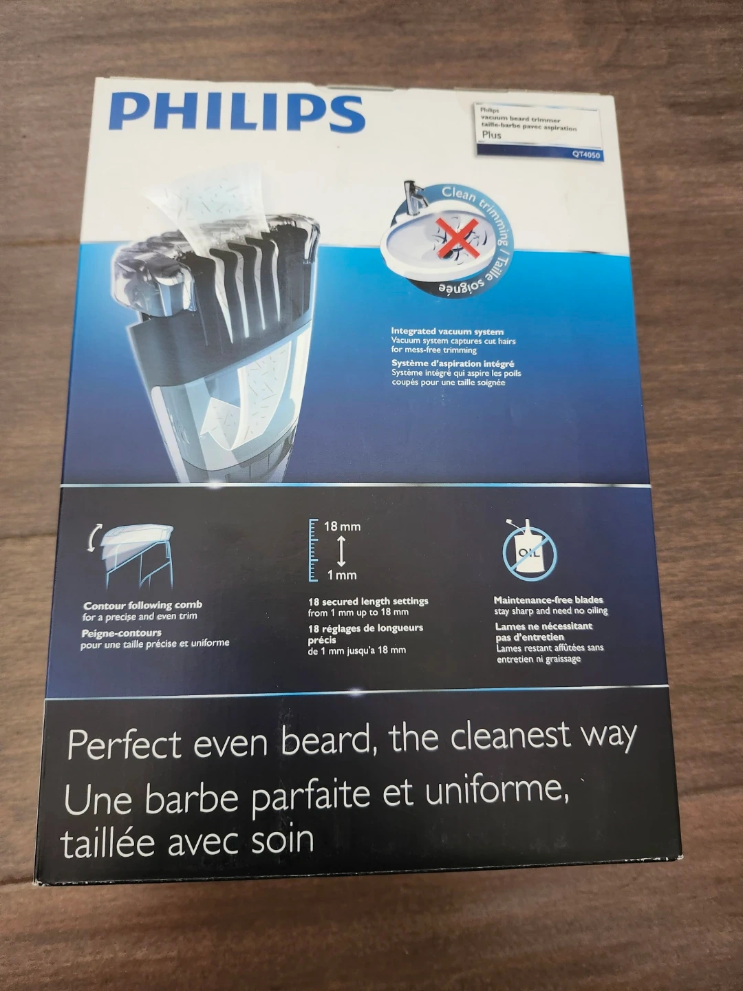 Selling a brand new Philips QT4050 beard trimmer! It's still in its original packaging and has never been used. This trimmer features an integrated vacuum system to capture cut hairs, making for clean trimming. It offers 18 secured length settings from 1mm up to 18mm, and has maintenance-free blades that stay sharp and need no oiling. Get a perfect, even beard with this easy-to-use trimmer!