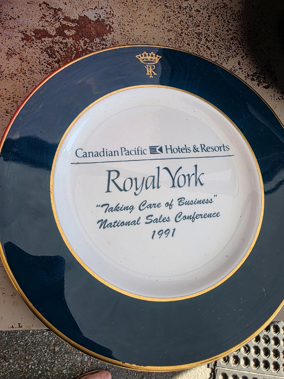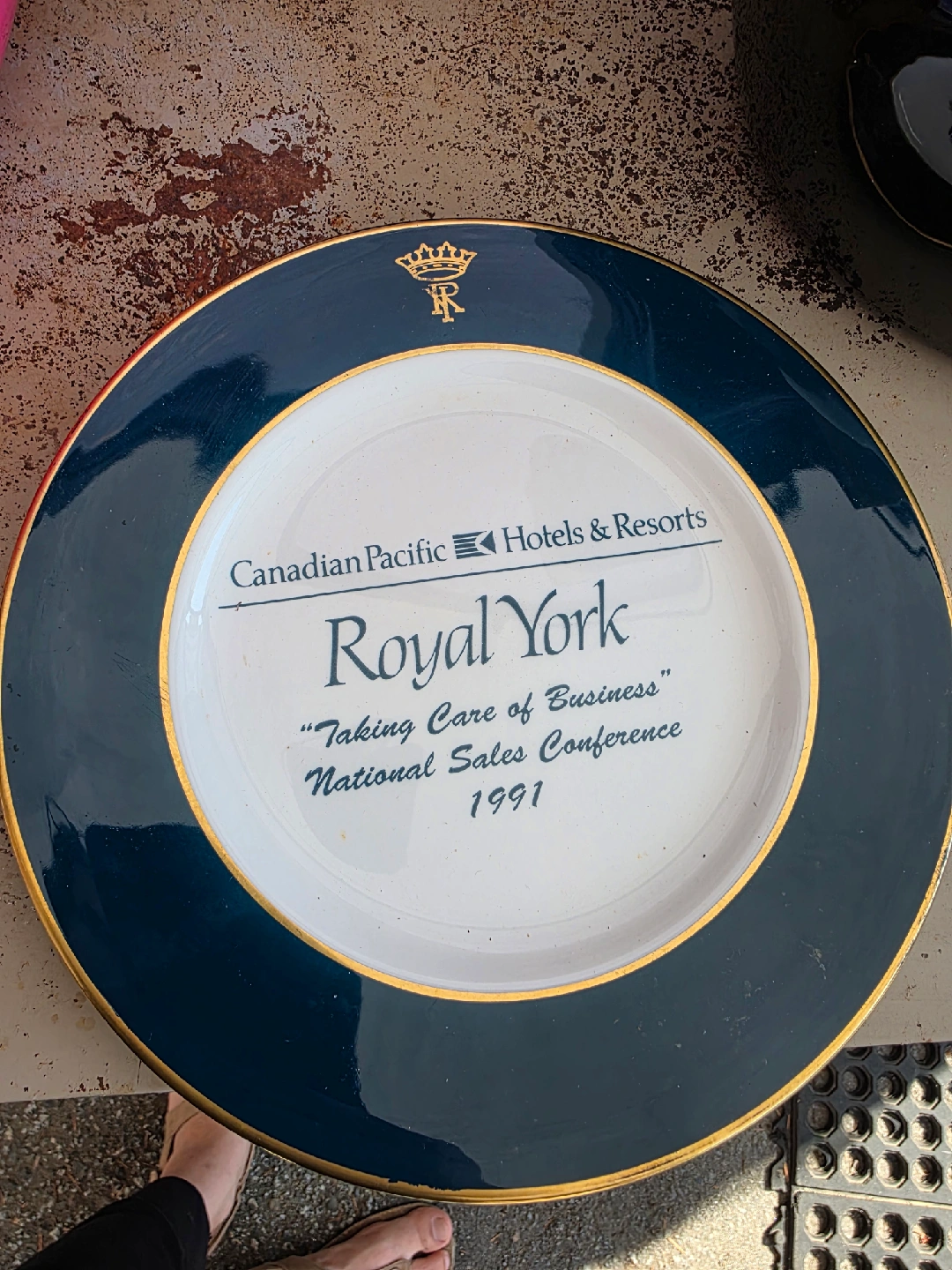 25Selling a commemorative Royal York plate from the Canadian Pacific Hotels & Resorts. It commemorates the National Sales Conference in 1991 with the slogan "Taking Care of Business". It's a lovely piece of Toronto history! The gold design is really gold.