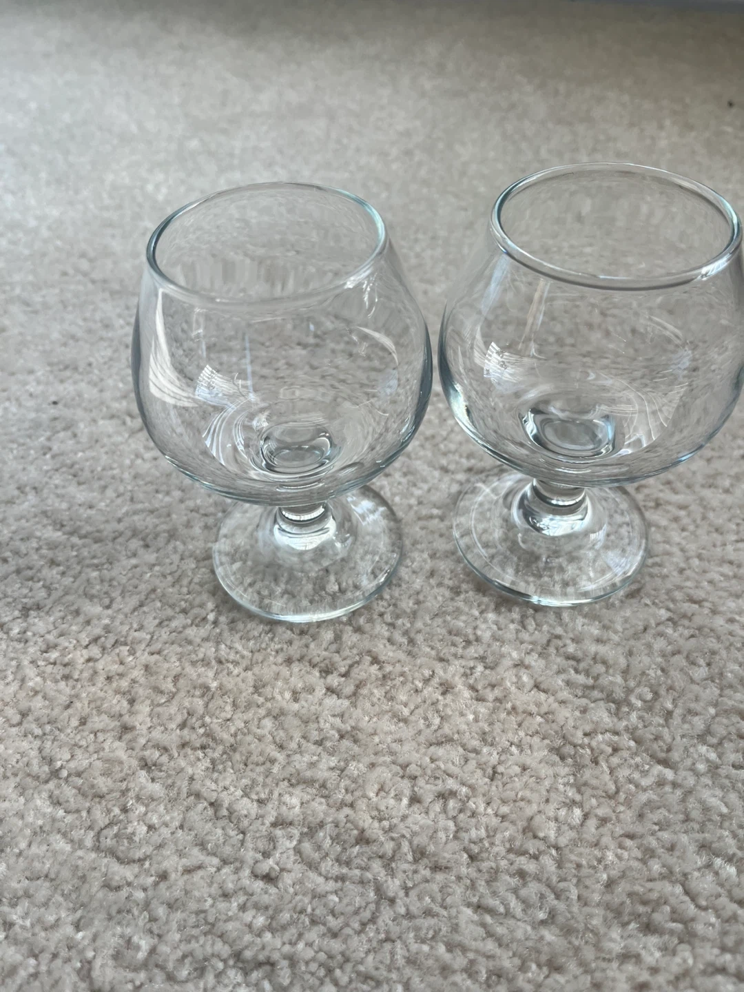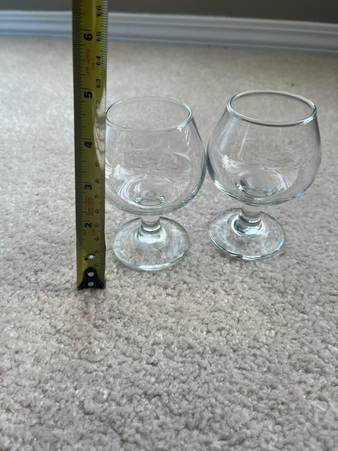 Selling a set of two brandy glasses! They're in great shape and ready for your favourite after-dinner drink. They stand about 4 inches tall.