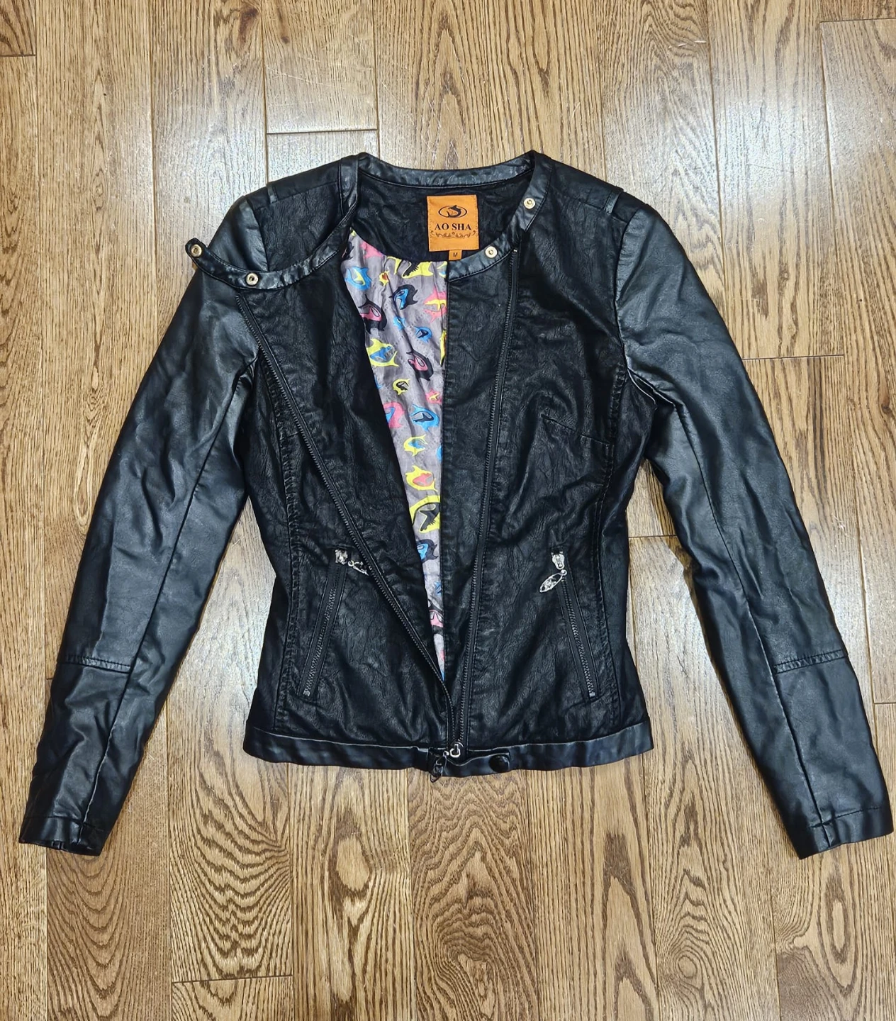 This stylish black AO SHO jacket, in size medium, is designed with a unique asymmetrical zip front and a sleek, soft and subtle leather. It’s perfect for adding an edgy touch to any outfit. The jacket is pre-loved but still has plenty of life left.