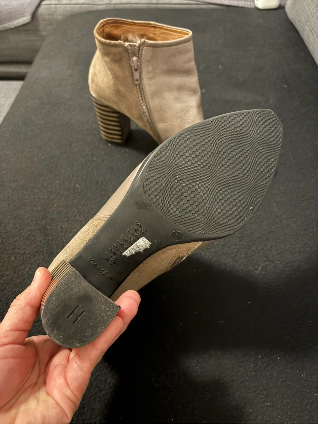 Stylish Hispanitas ankle boots in a neutral leather and suede combo! They have a unique striped heel and a side zipper for easy wear. Size 37.