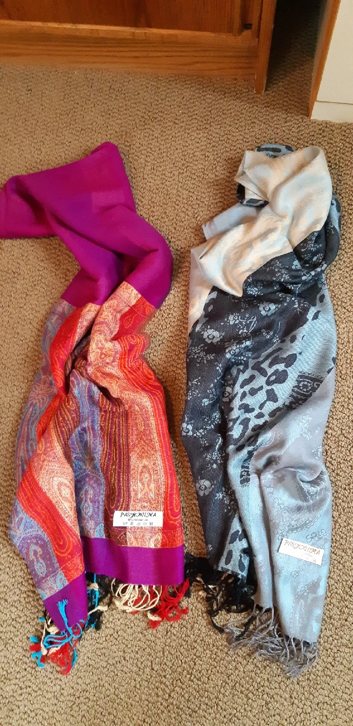 8282 beautiful scarves/shawls made from 100% pashmina wool Both have fringed edges. They're super soft and warm, perfect for adding a touch of elegance to any outfit. Perfect condition!