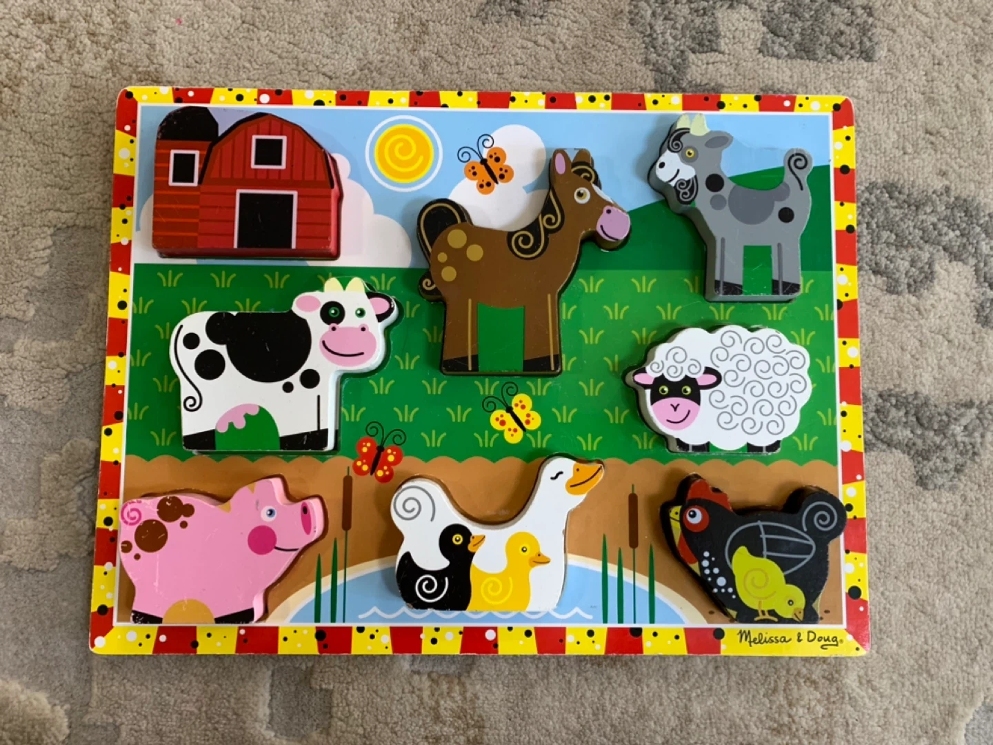 502This is a Melissa & Doug farm animal puzzle. It's a wooden puzzle with cute farm animals and a great first puzzle for little kids to work on hand eye coordination.