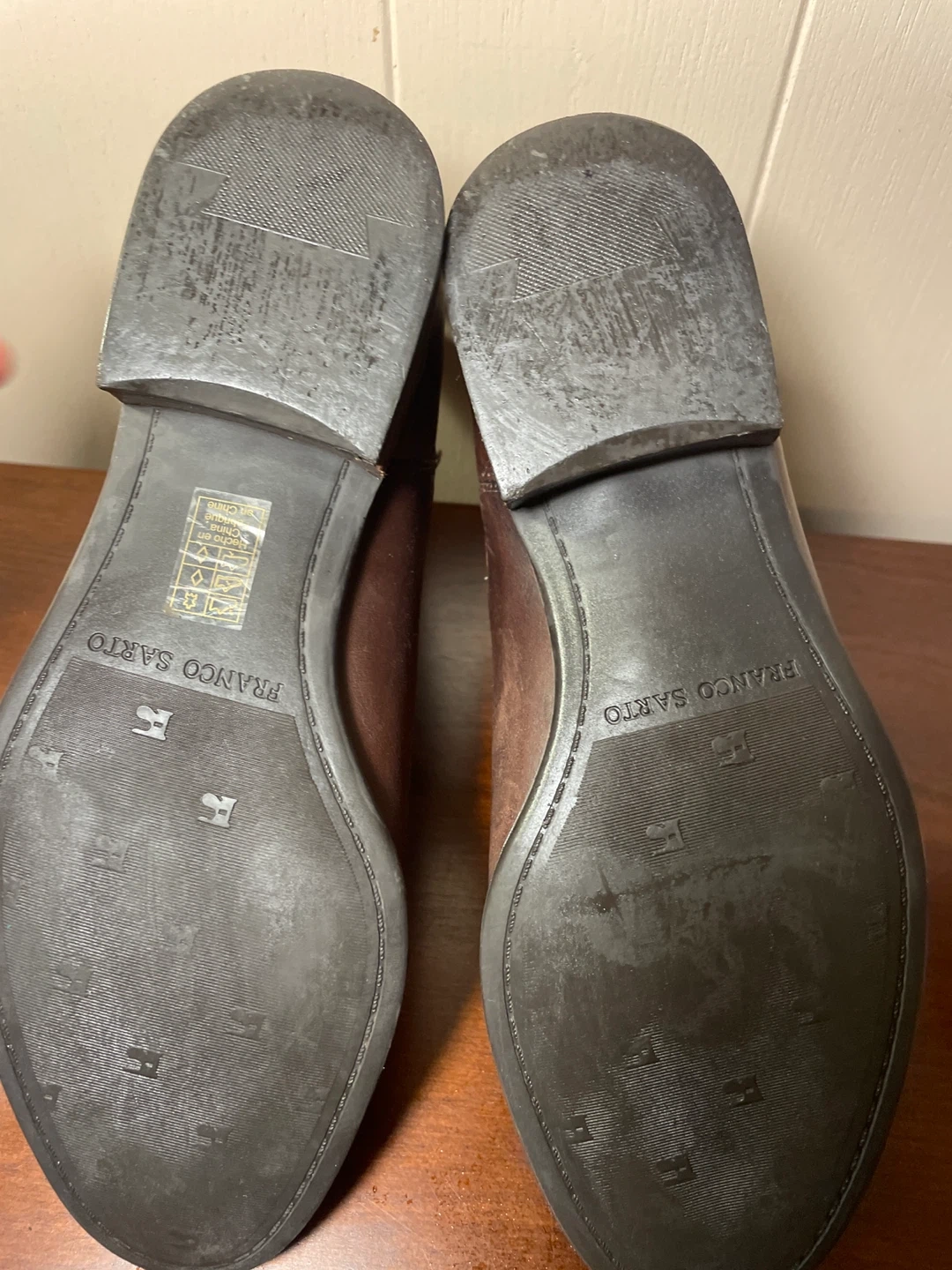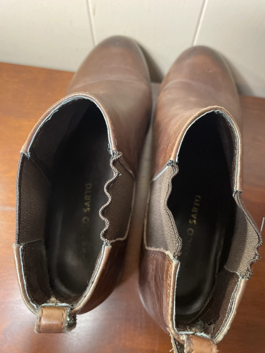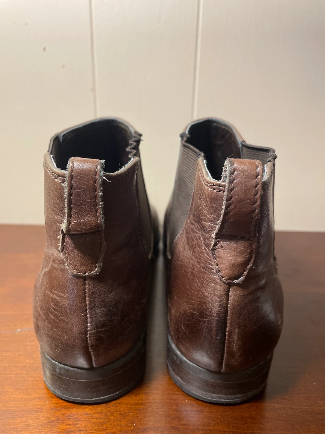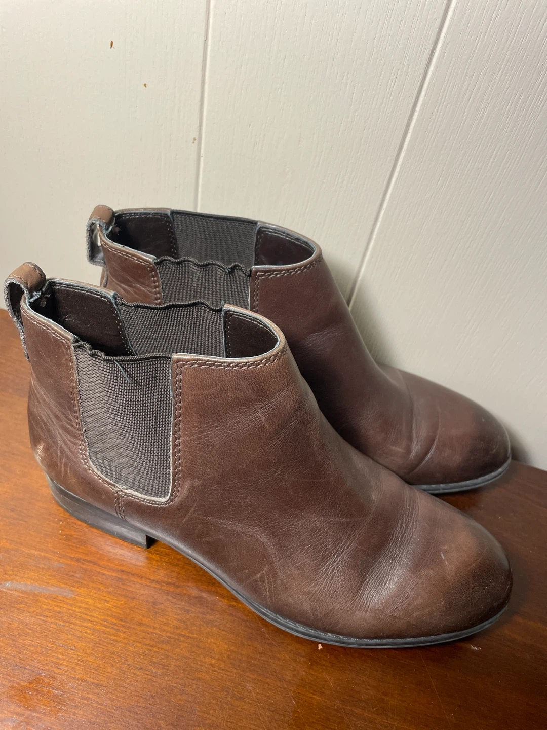 Selling a pair of Franco Sarto Chelsea boots in brown leather. They are a women's size 6. They have some signs of wear, but are still in good condition and ready for a new home!