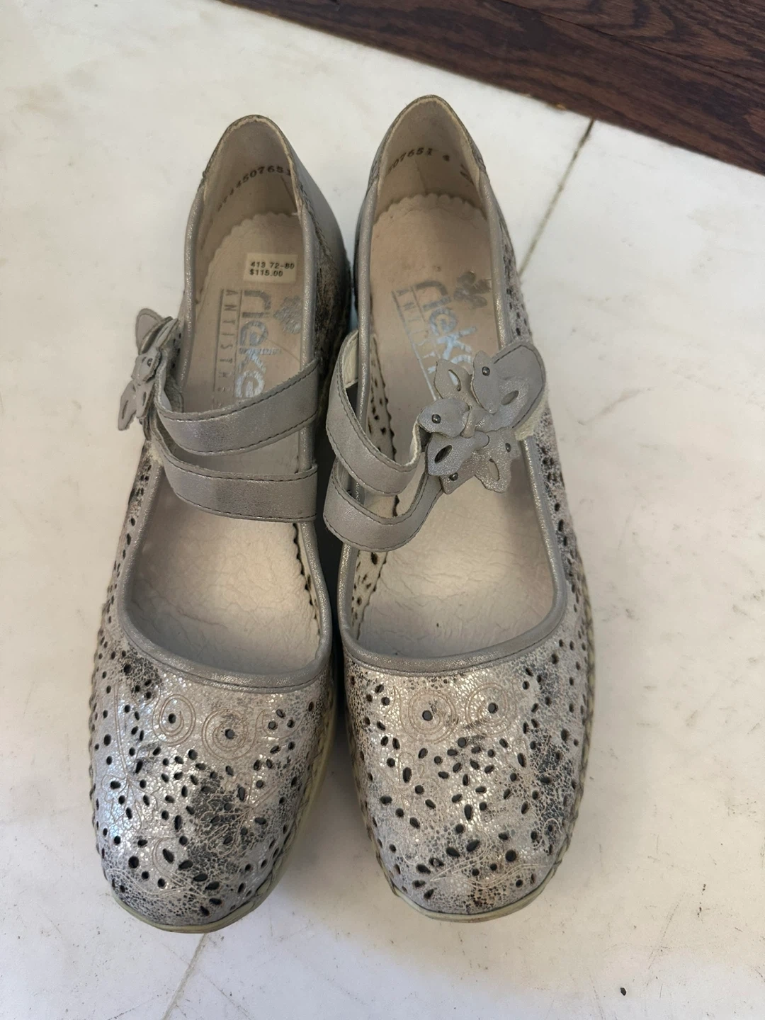 53Cute Rieker Mary Jane style shoes in a shimmery silver color! These are size 38, which is about a US size 7.5They have a fun floral cutout design and a comfy, casual style. Worn once