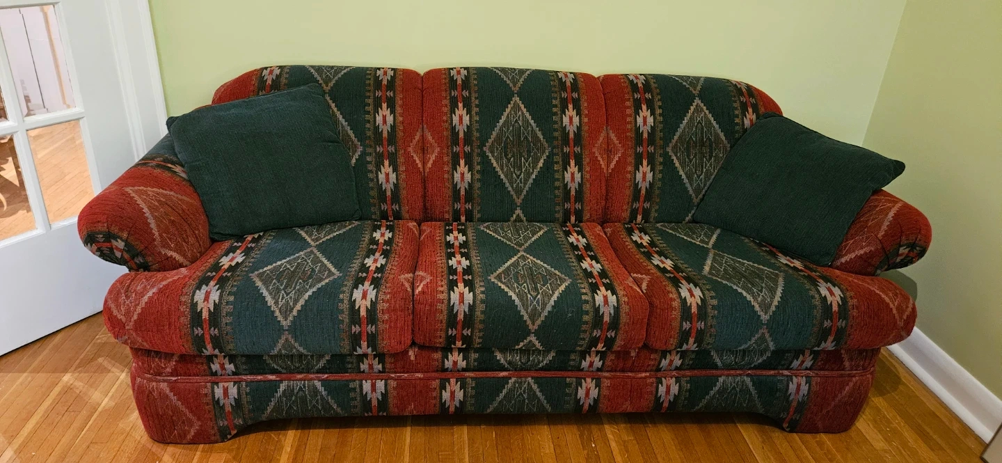 Selling a cozy armchair/loveseat and sofa set with a unique patterned design! The set features a mix of red, green in an eye-catching pattern. Perfect for adding a touch of character to your living space. It's in great condition and ready for a new home!
