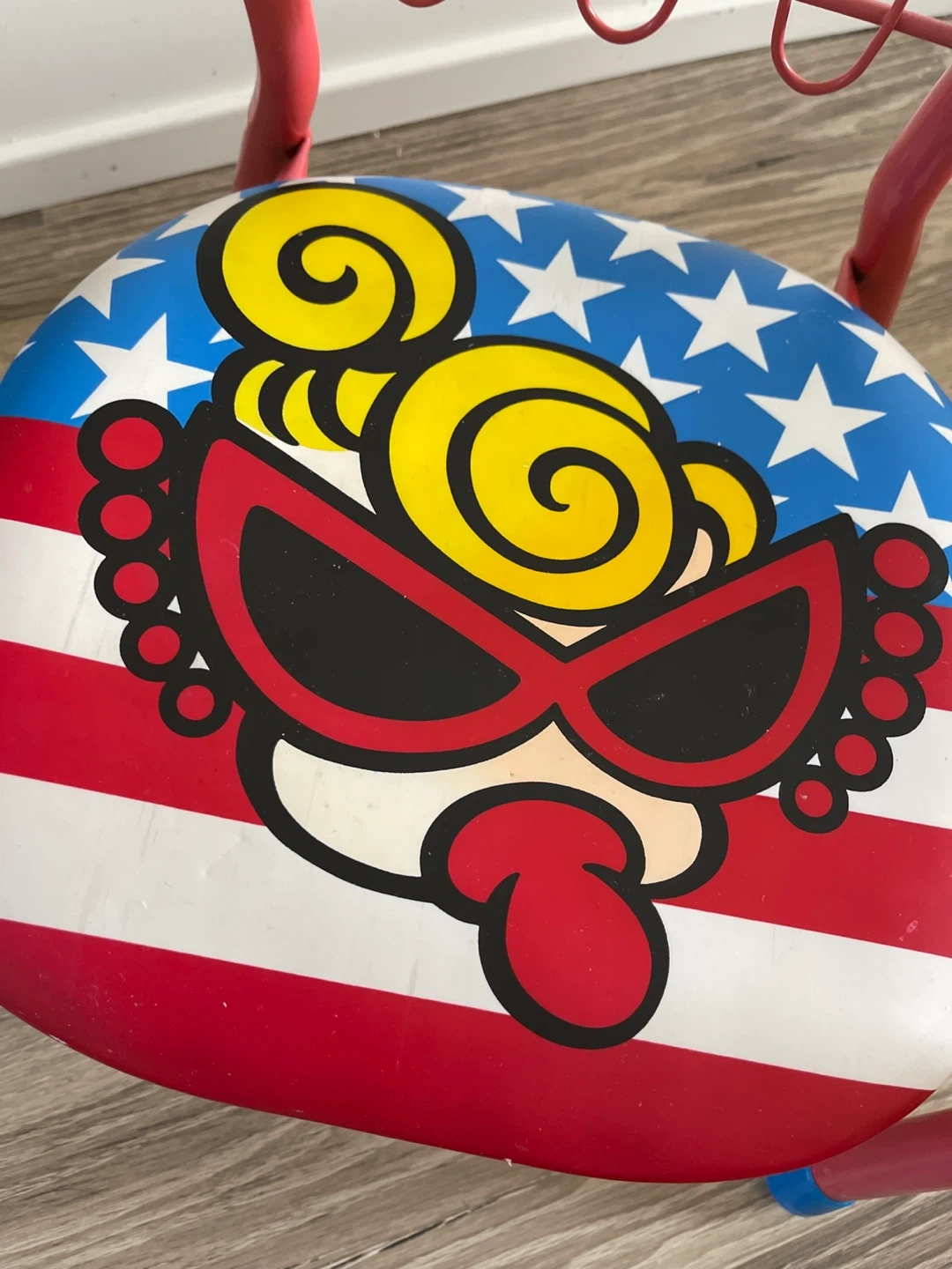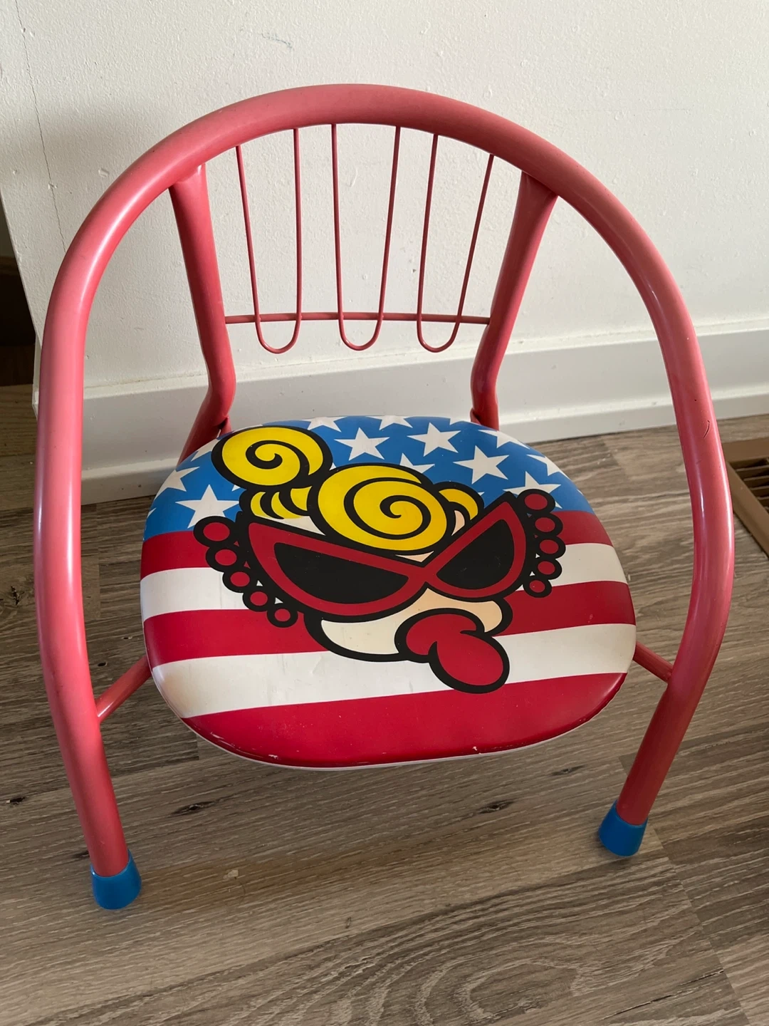 Here's a cute vintage metal chair for kids! It has a unique cartoon design on the seat with an American flag-inspired background. The frame is a bright pink colour, and it's in good condition for its age. Perfect for a playroom or as a decorative piece!