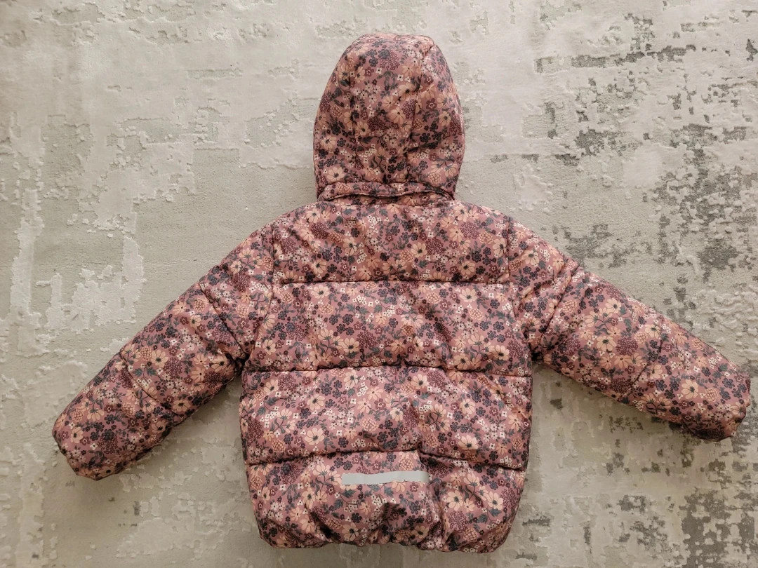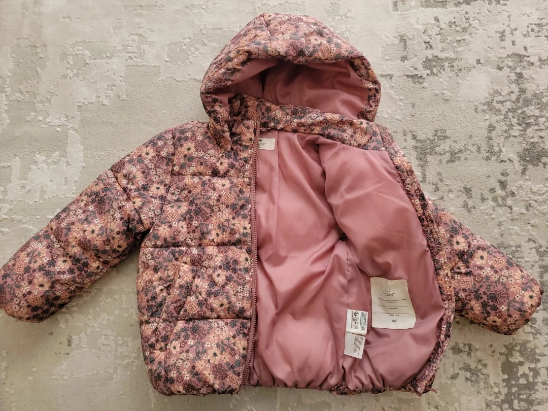 Cozy and stylish H&M puffer jacket for your little one! This adorable jacket features a beautiful floral print and is perfect for keeping your child warm during cooler weather. Size is 4-6Y.