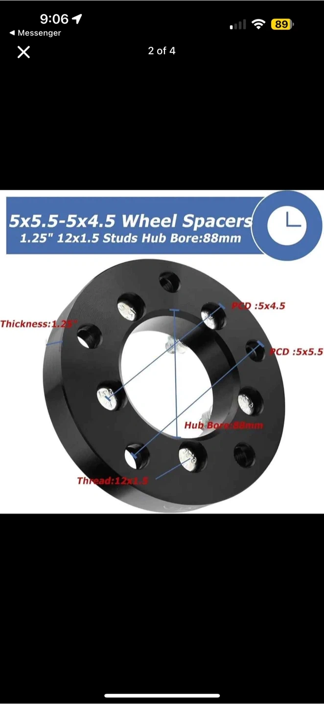 Selling a set of 5x5.5-5x4.5 wheel spacers. They are 1.25" thick and come with 12x1.5 studs. The hub bore is 88mm. These spacers are precision CNC machined and hard anodized, made from forged 6061-T6 billet aluminum.