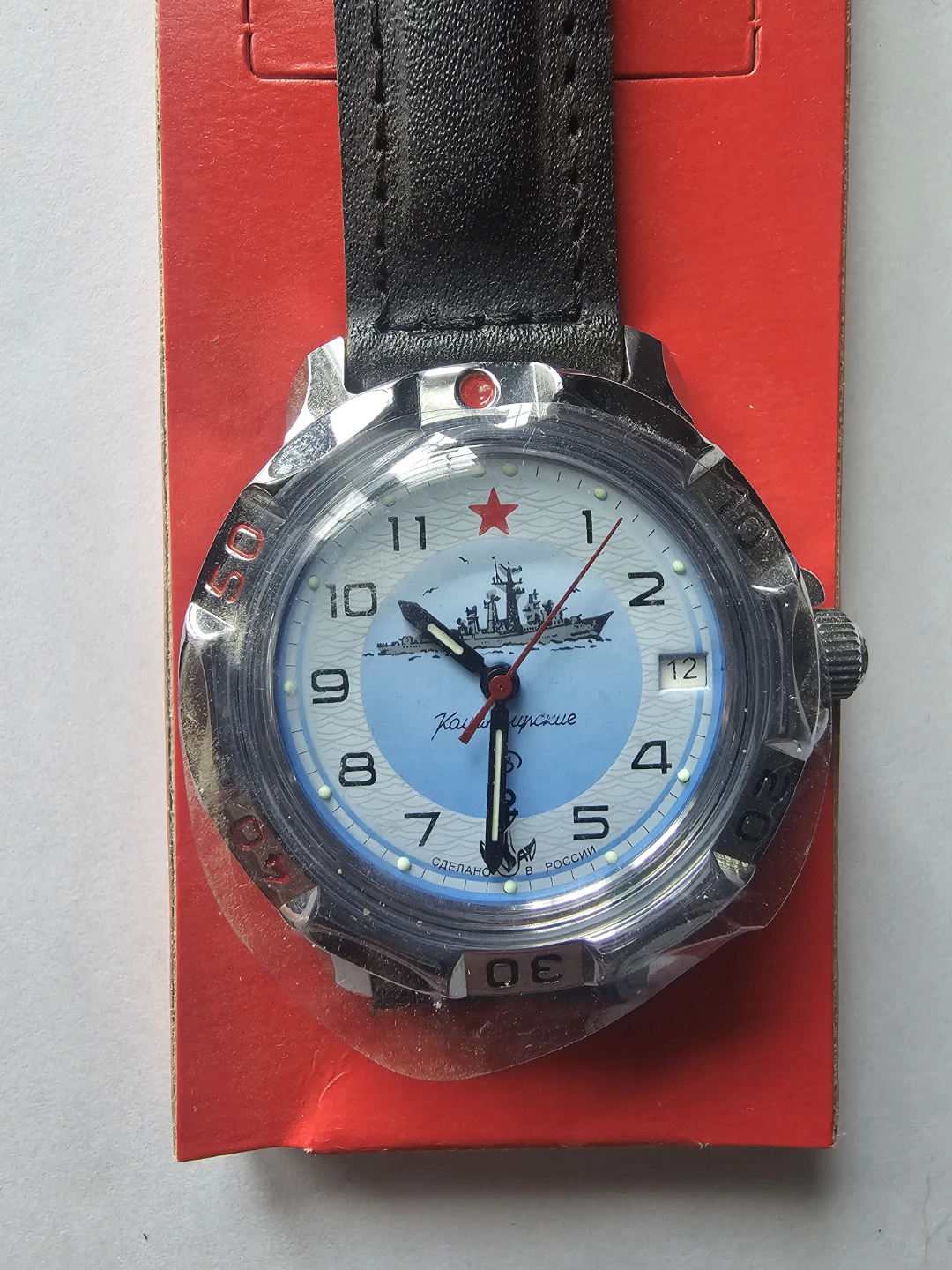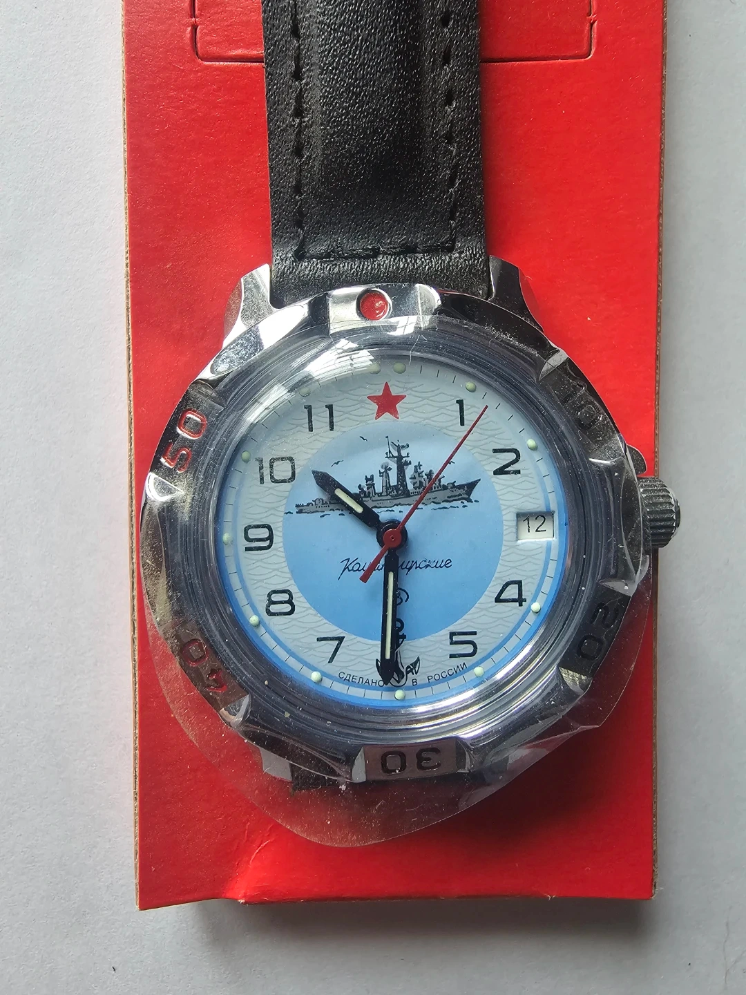 Selling a brand new Vostok Komandirskie automatic watch! It features a unique design with a ship on the dial and a red star at the 12 o'clock position. The watch comes with its original box and is in perfect condition.