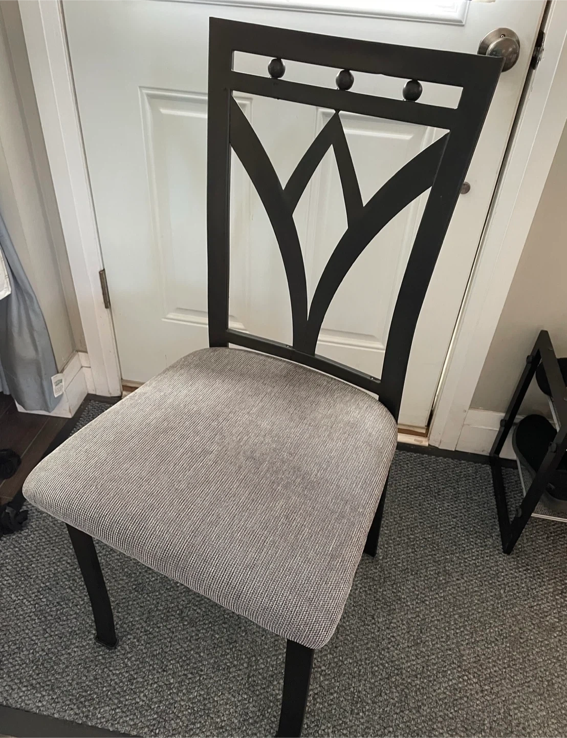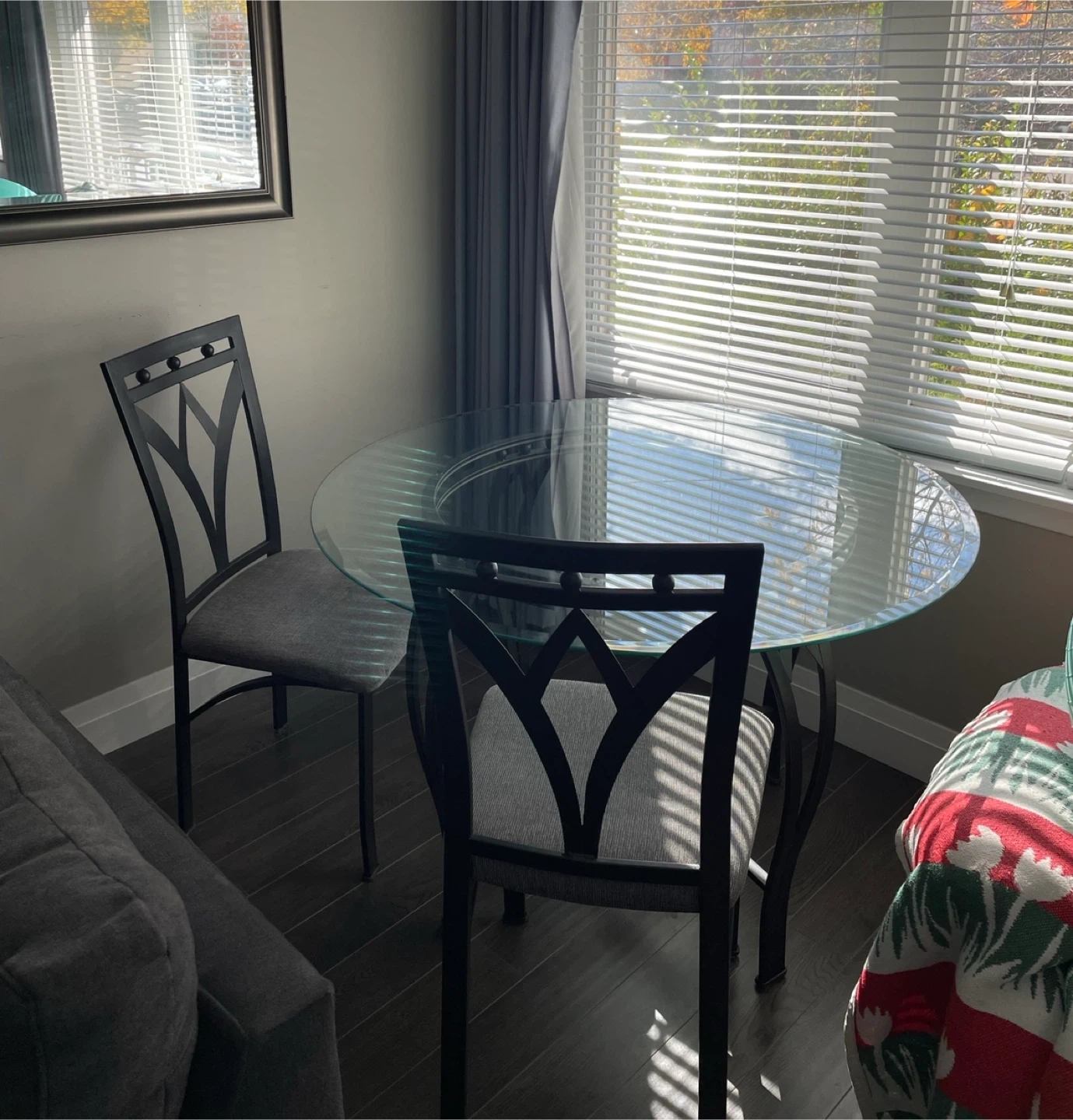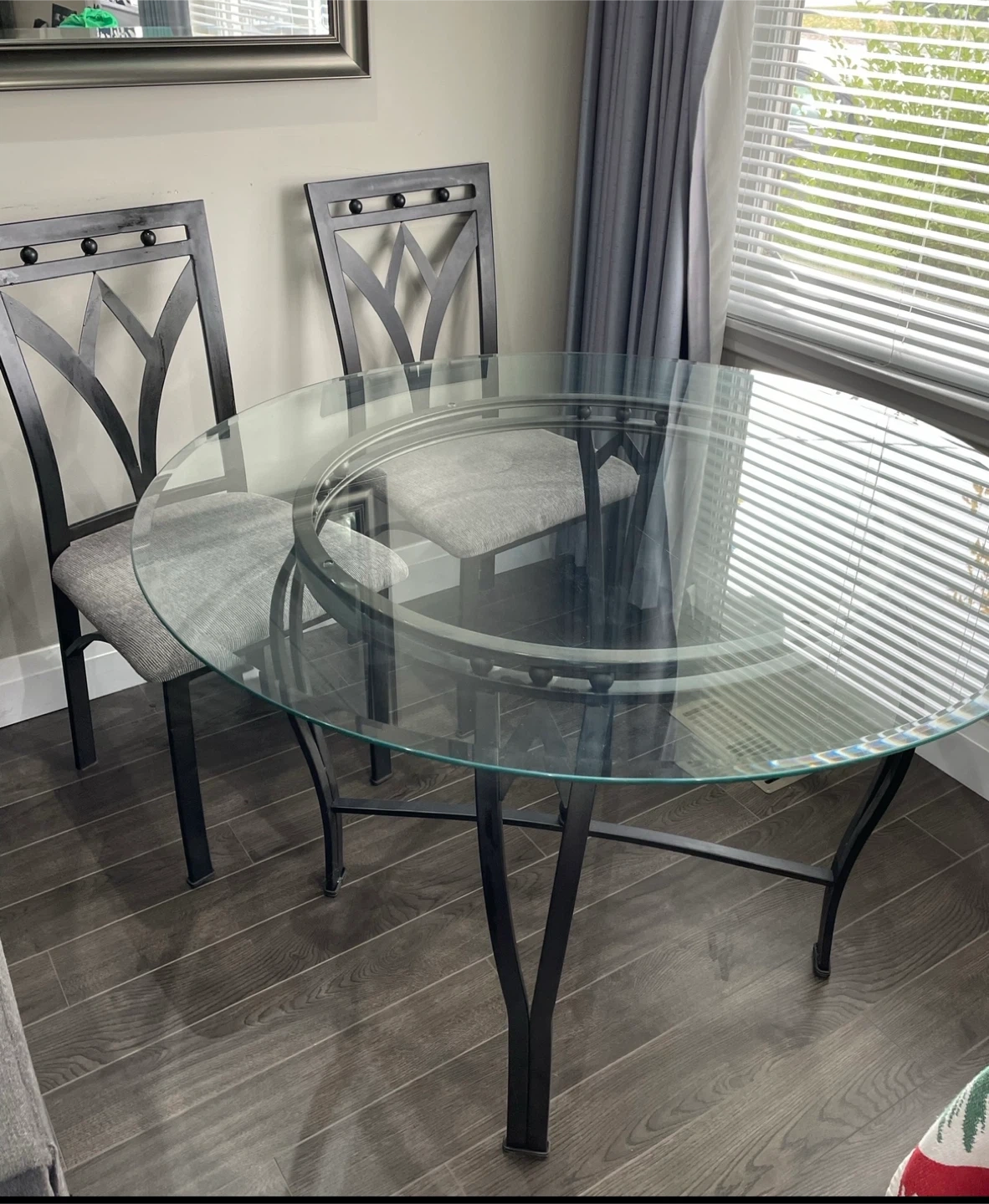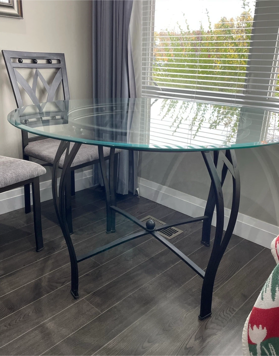 Selling a round dining table with a glass top and four matching chairs. The table features a sleek, modern design with a black metal frame, perfect for a smaller dining space or kitchen nook. The chairs have a similar black metal frame with a decorative back and comfortable grey upholstered seats. It's in excellent condition, barely used and ready for a new home!