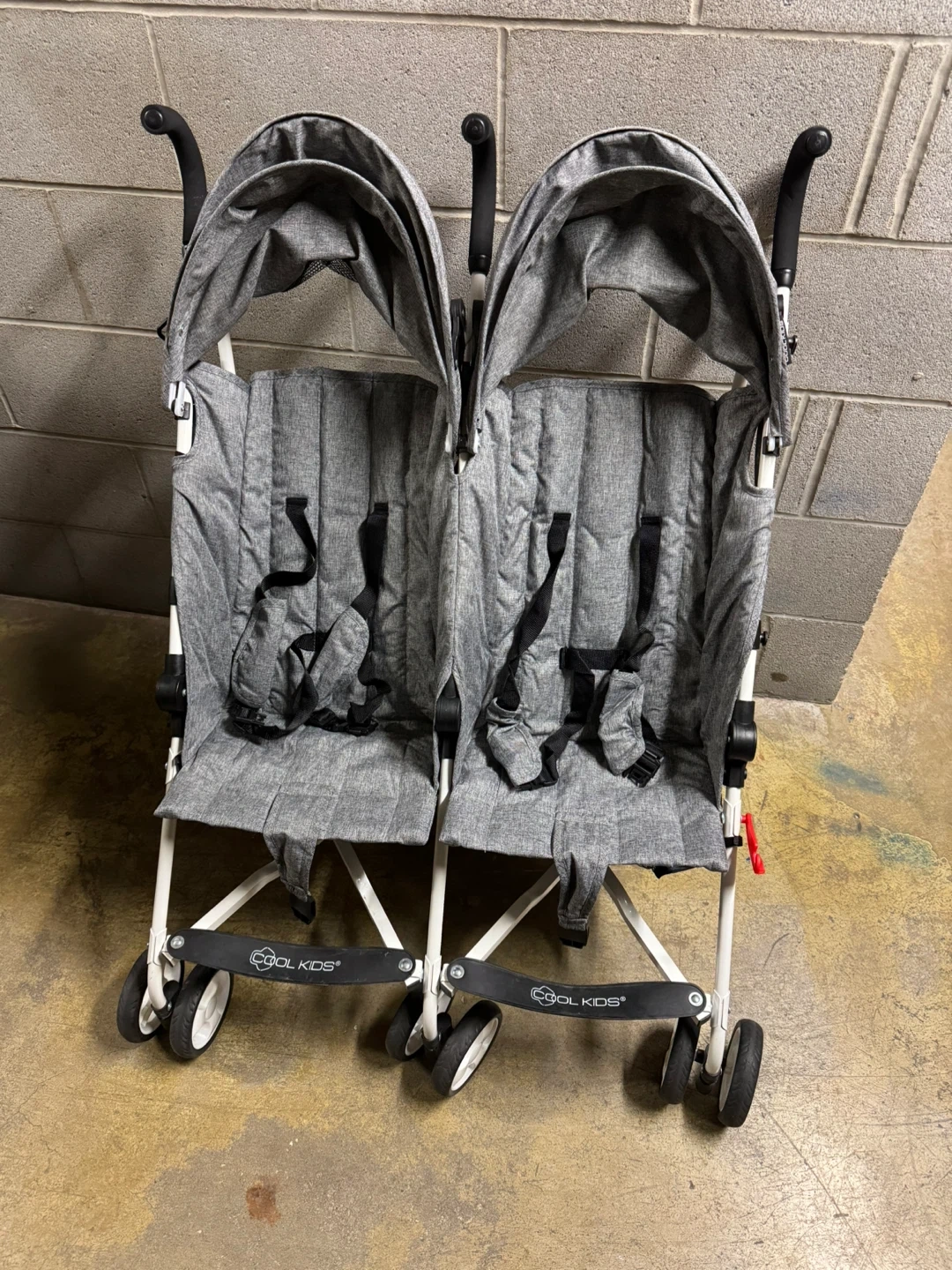 Double stroller. grey colour and folds up for easy storage and transport. Light weighted. Large under basket. Shoulder strap. Stoppers.