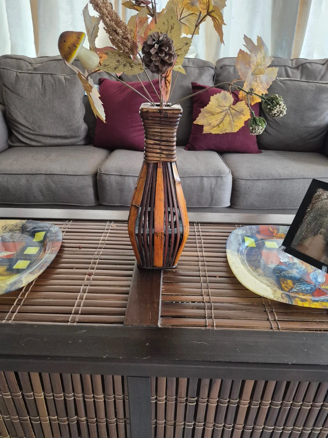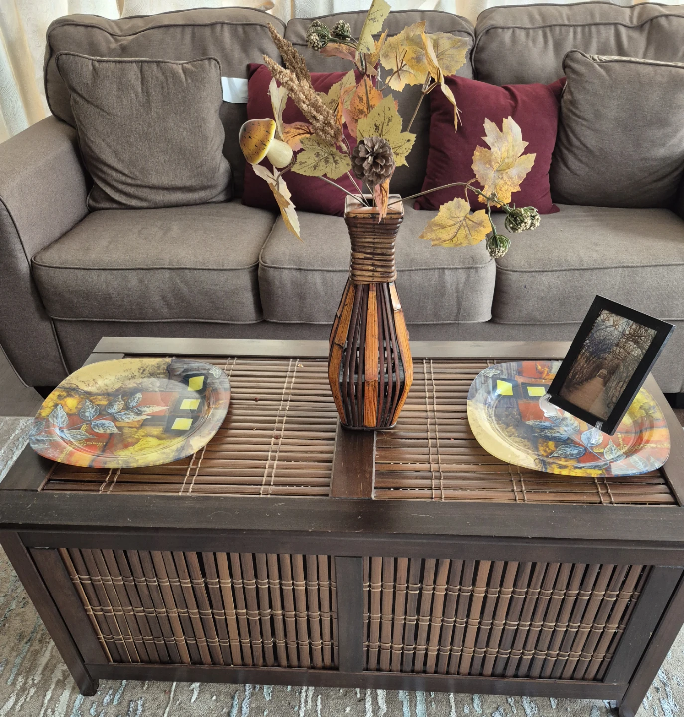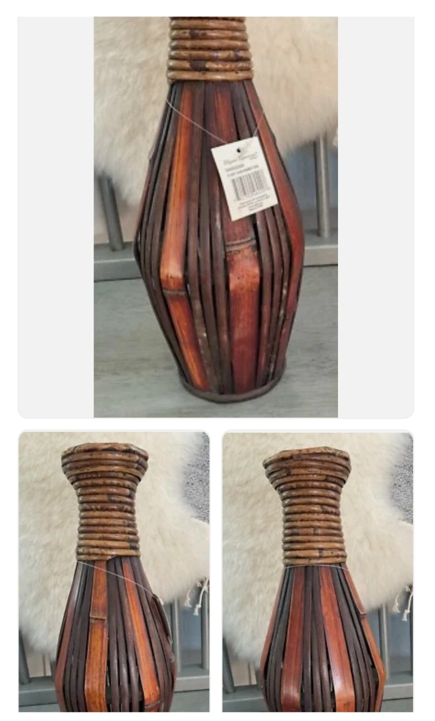 This decorative vase from Pier 1 Imports is perfect for adding a touch of warmth to any room. It features a unique woven design with brown and orange tones. It's in great condition and ready to find a new home!