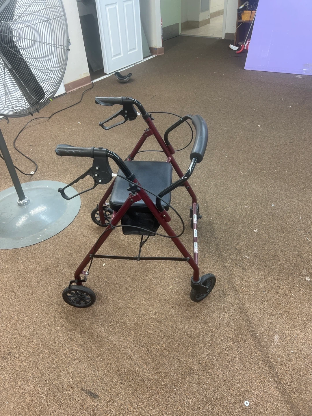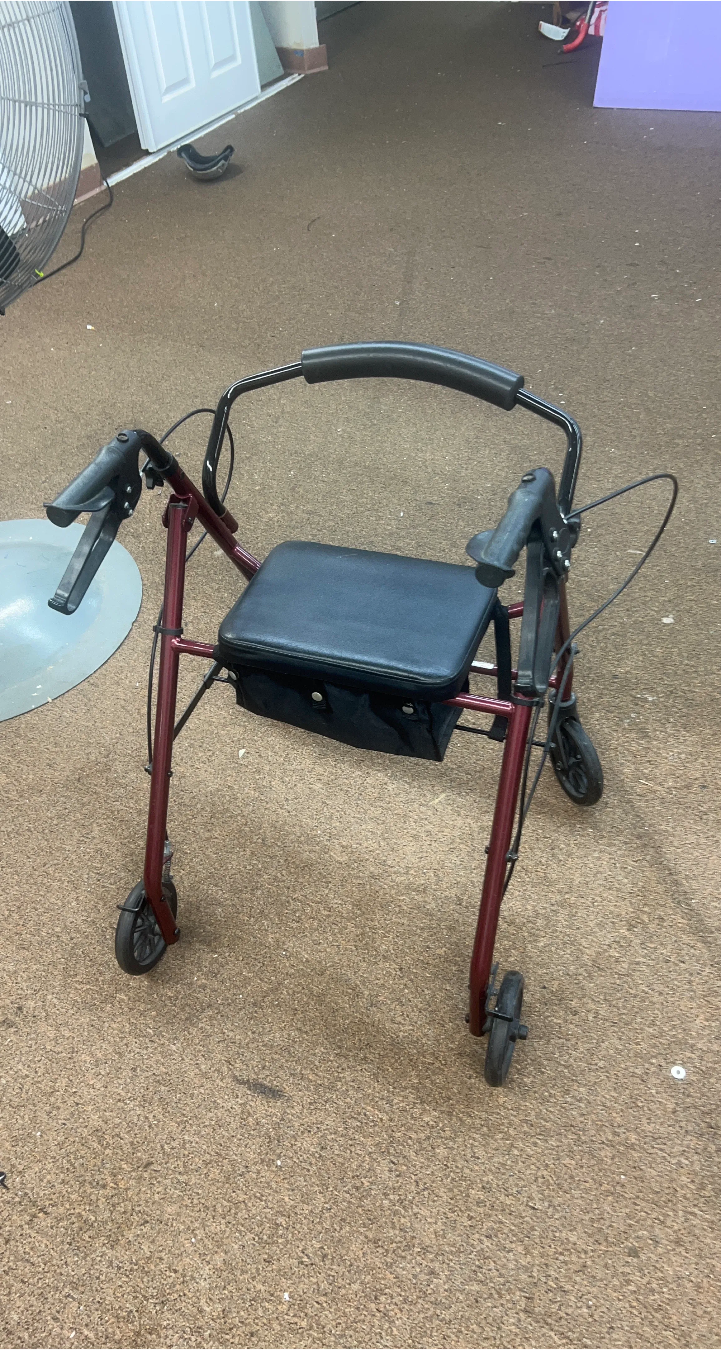 Selling a rolling walker with a seat. It's in good condition and ready to help someone get around comfortably. It features a padded seat and a storage pouch underneath for convenience. The walker is a burgundy color and has adjustable handles for a customized fit