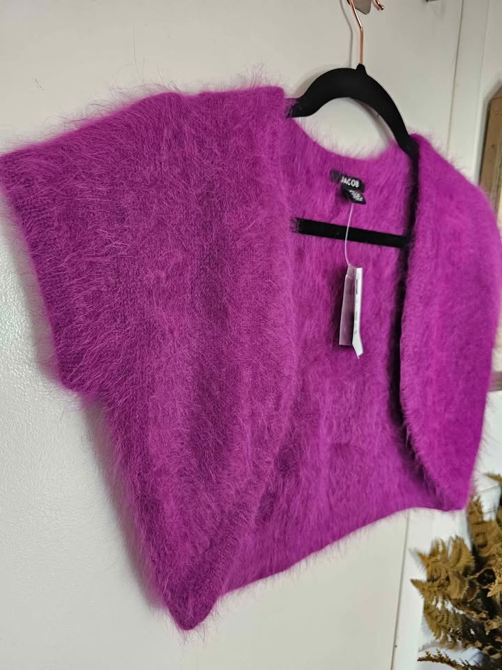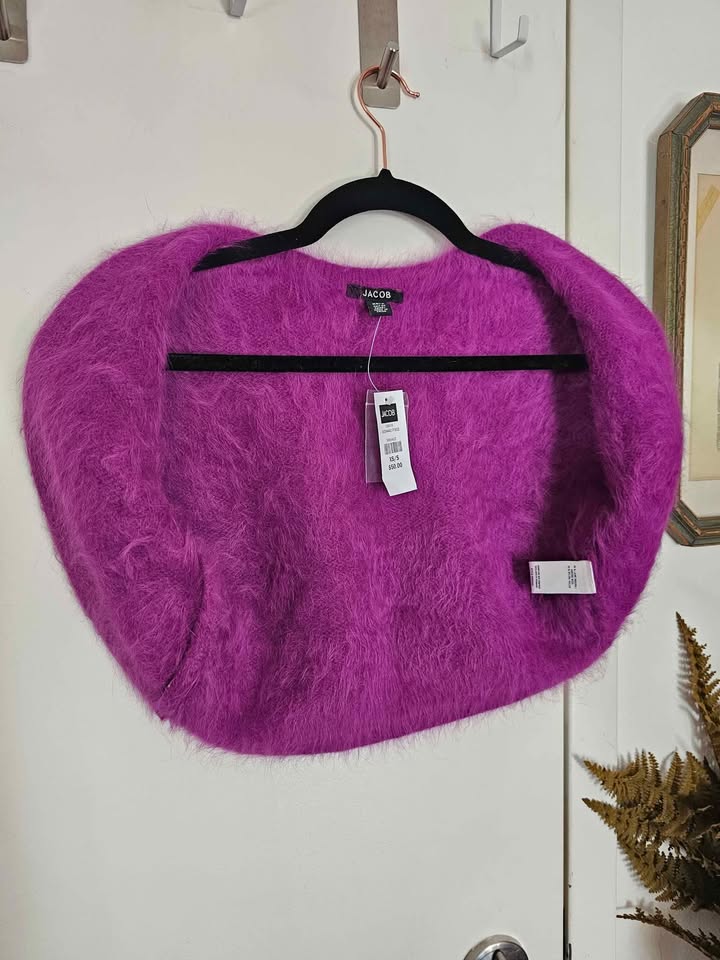 Vintage 90s Y2K deadstock, still unworn with tags. Fuzzy purple cropped cardigan/ shrug sweater, made of a blend of 80% angora rabbit hair and 20% nylon. Perfect for wearing with a casual cami and jeans, or over a dressier outfit to stay warm at an event or party.