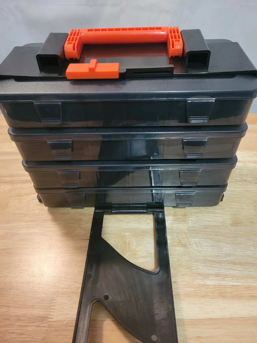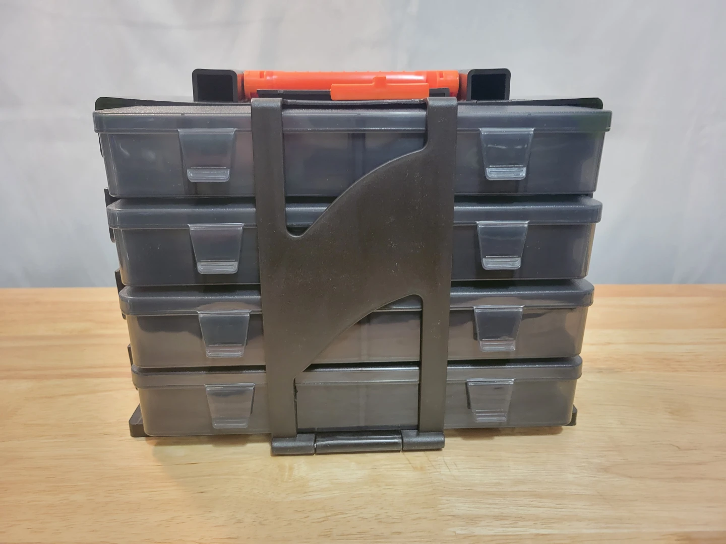 I'm selling a gray stackable storage container box. It has multiple compartments for organization. Perfect for storing small items and keeping things tidy