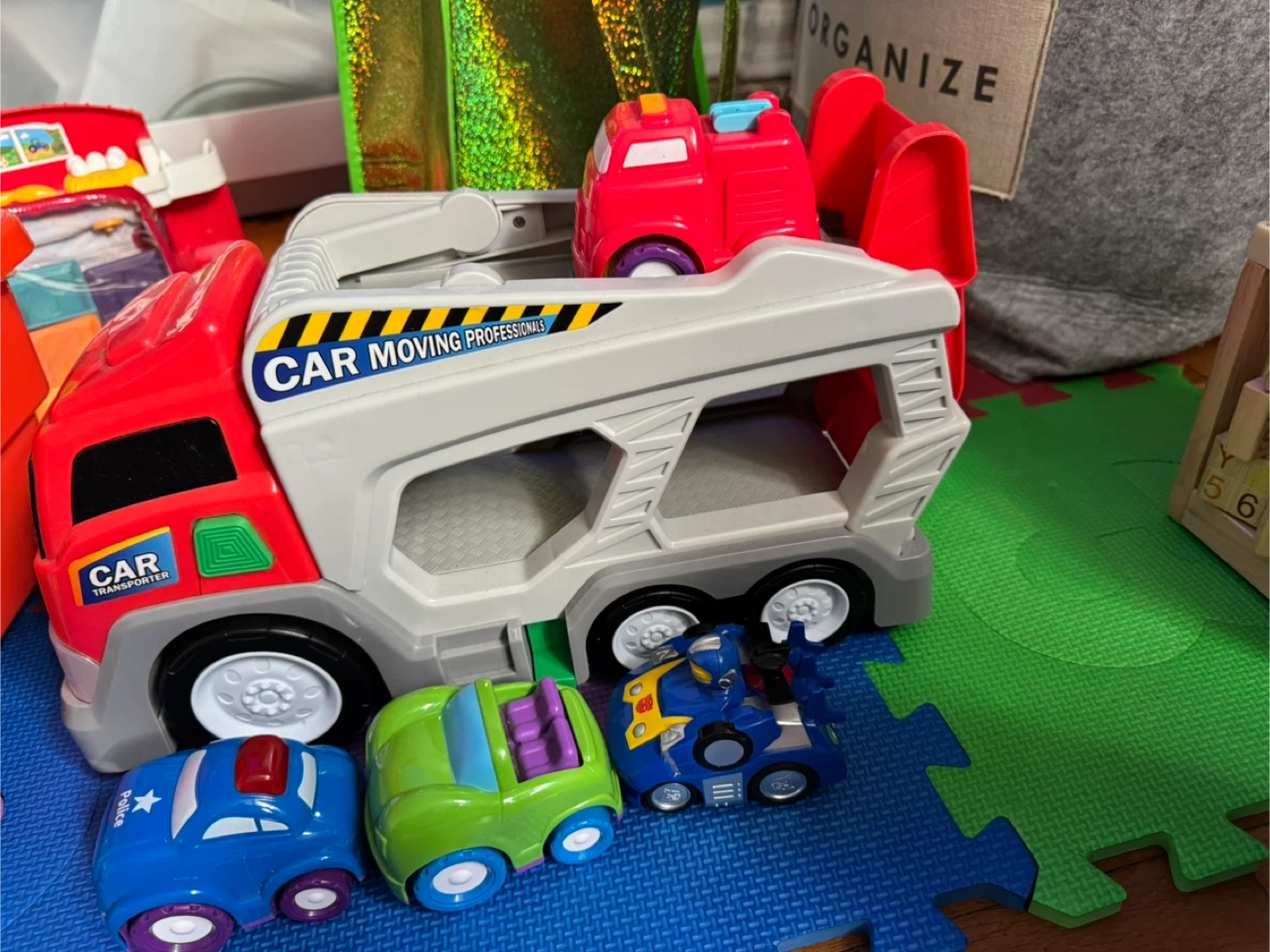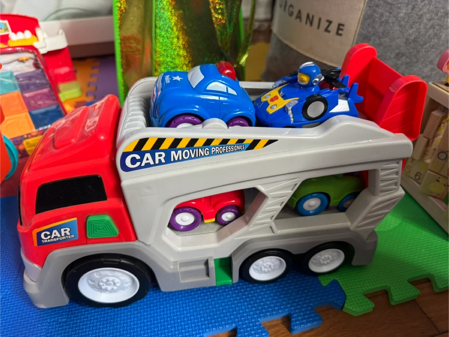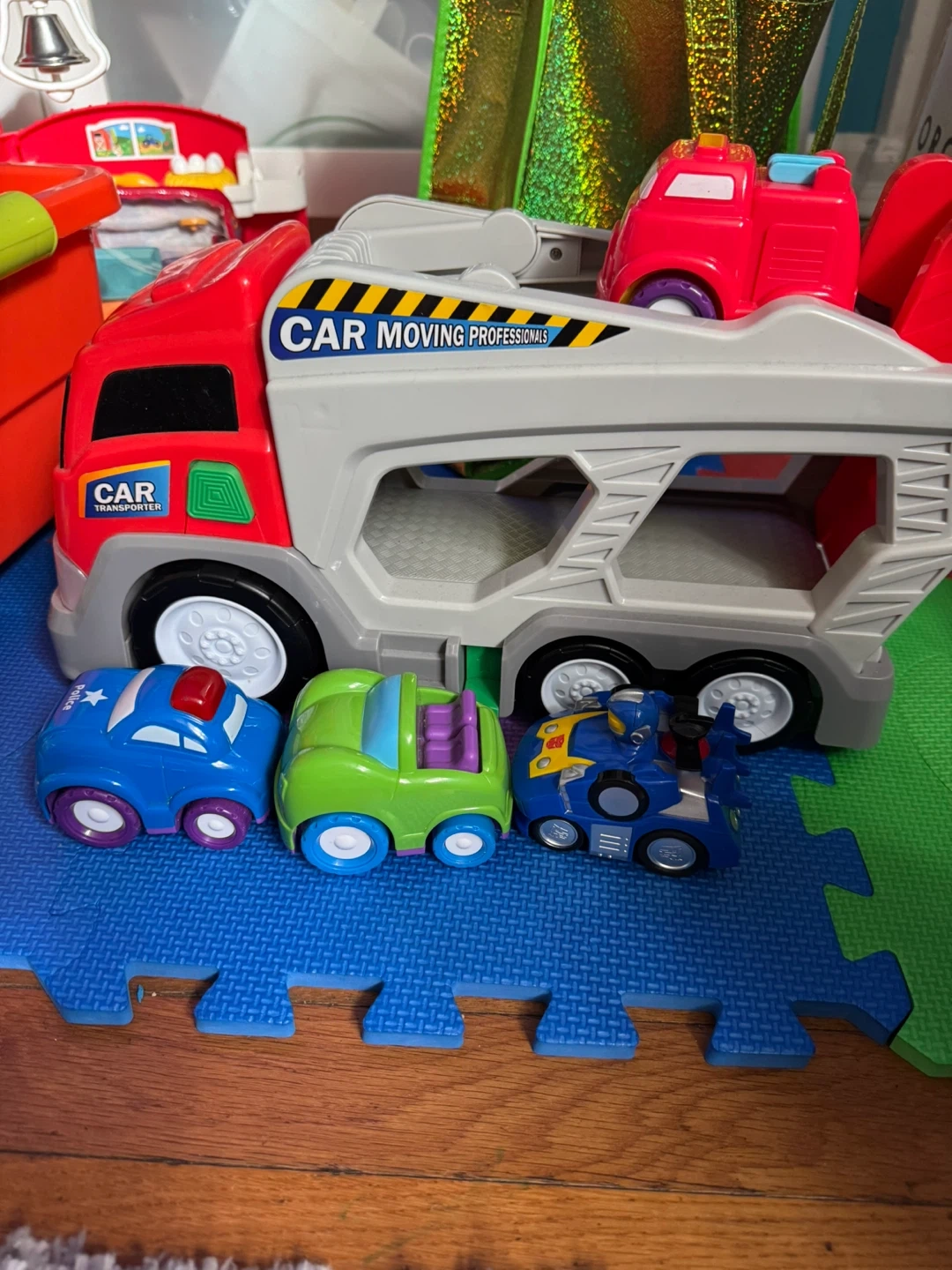 153This car transporter toy truck is ready for a new home! It comes with several mini cars that can be loaded onto the transporter. It's a fun toy for kids who love vehicles and imaginative play. The truck is in good condition and ready for hours of playtime