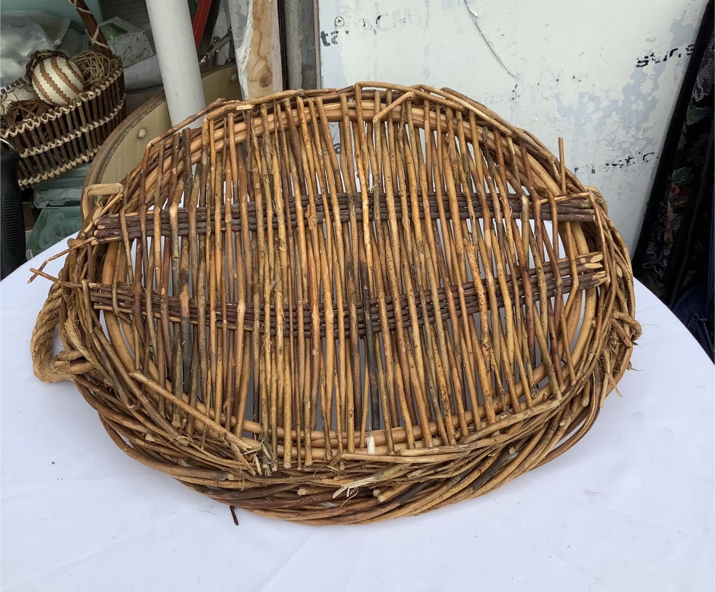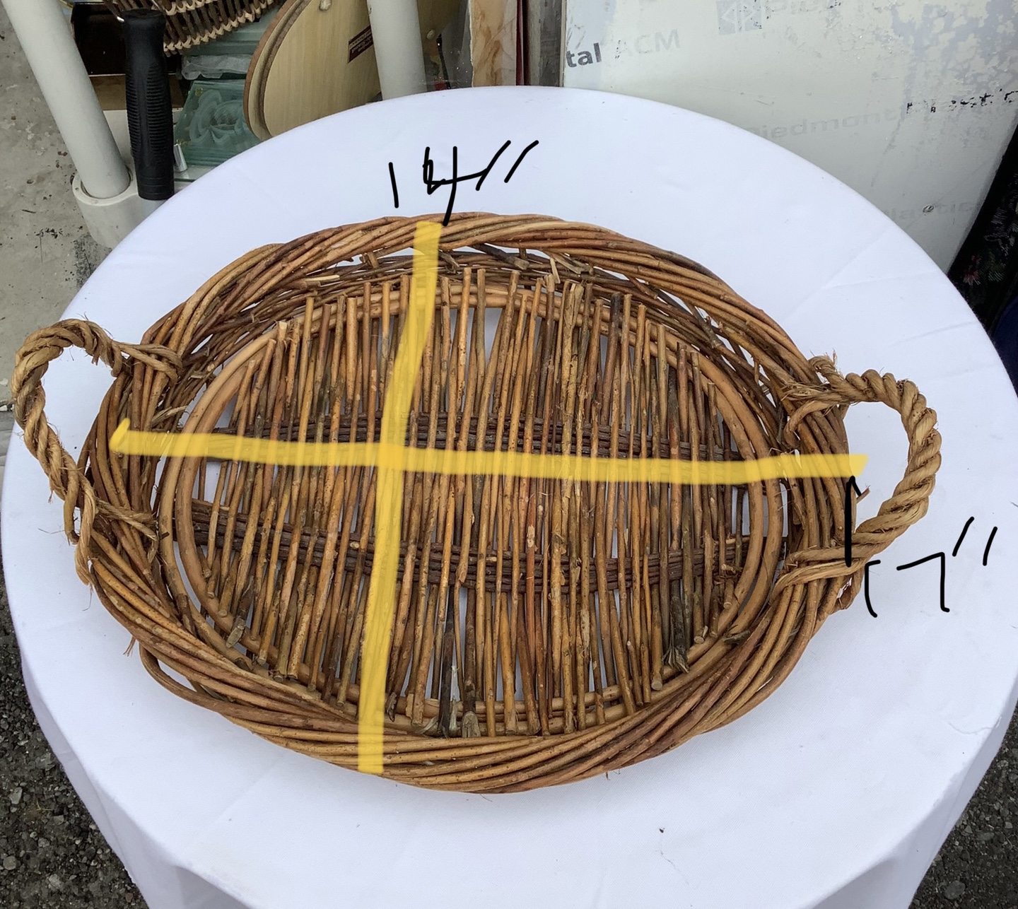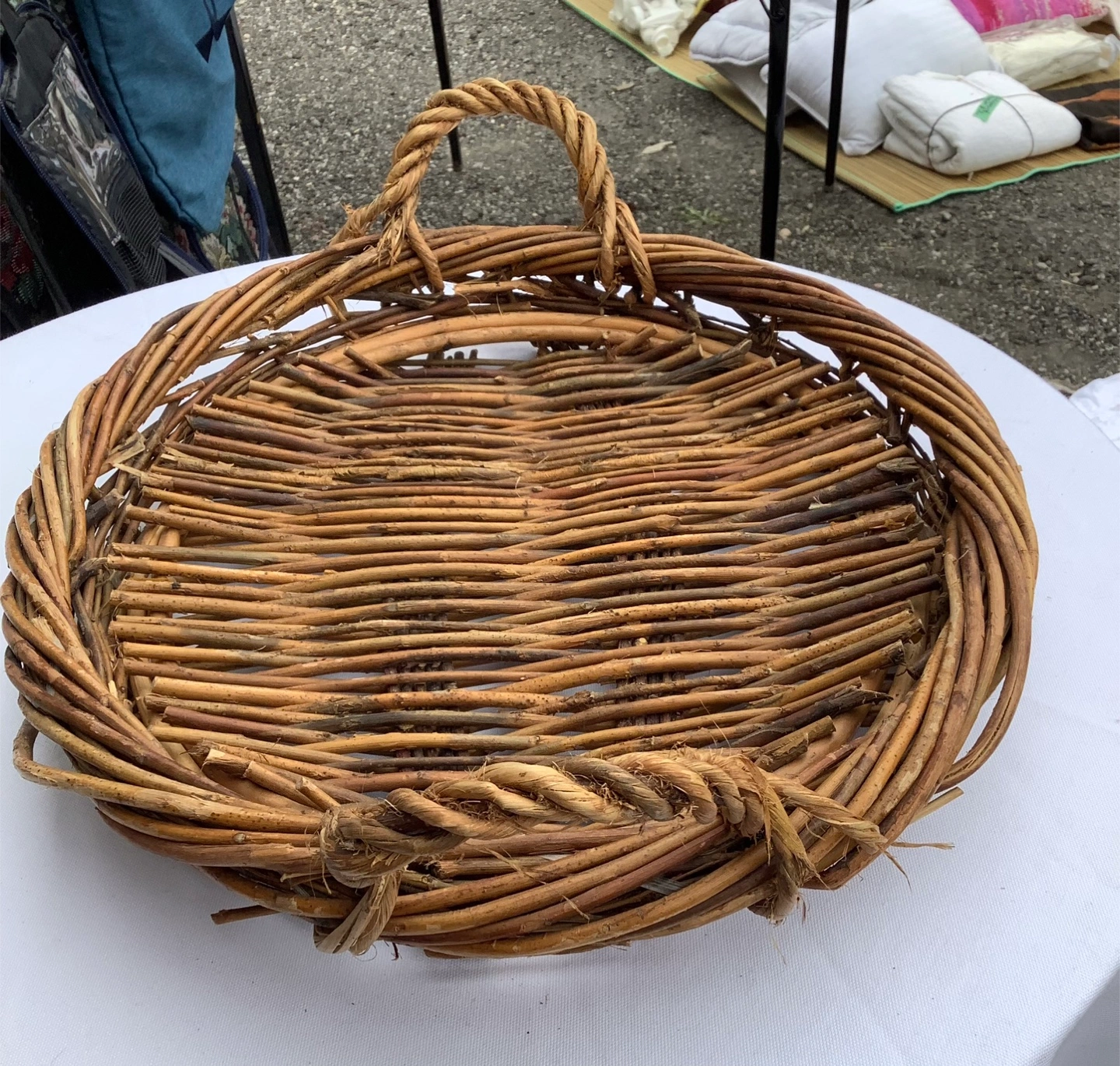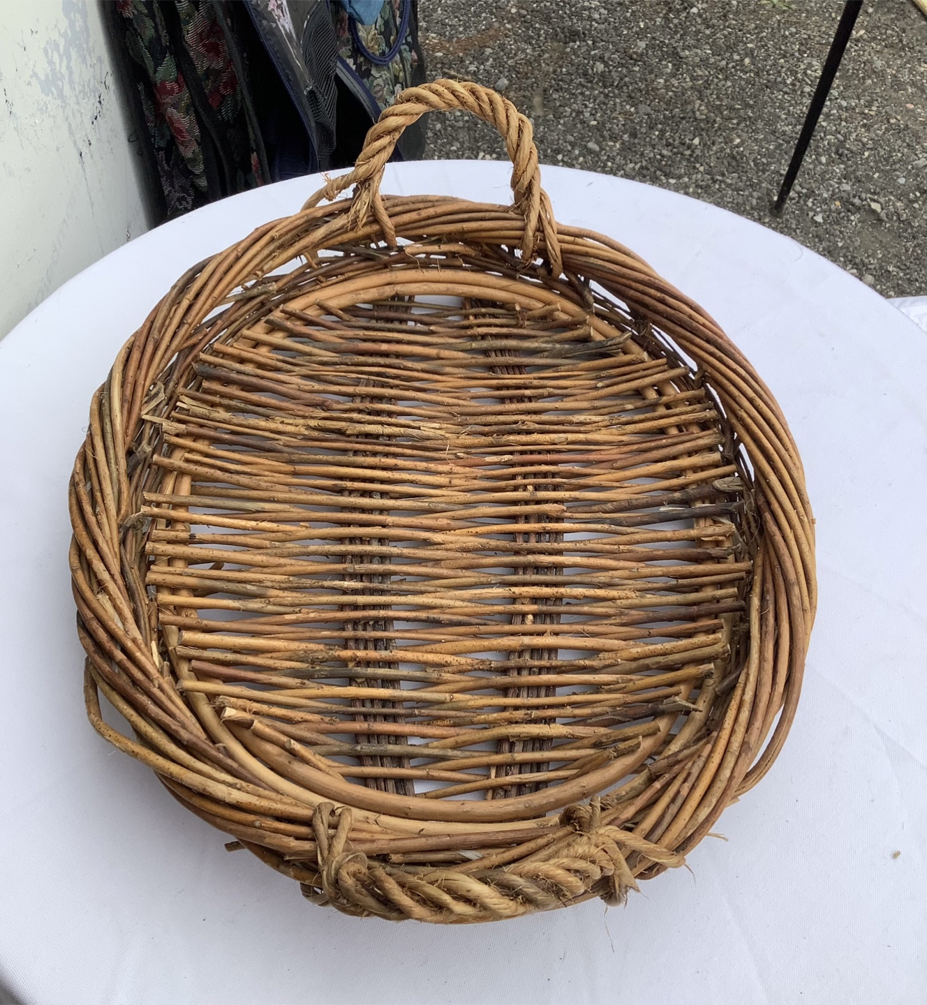 Selling a charming handmade wicker basket tray! It's perfect for adding a rustic touch to your home decor or for serving snacks and drinks. The basket measures approximately 14 inches in diameter. It's in great condition and ready for a new home. Porch pickup