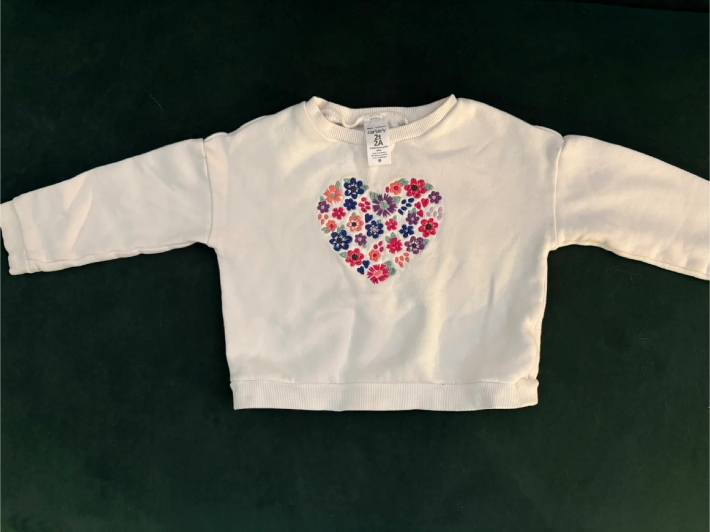 A super cute sweatshirt for your little one! This size 2T sweatshirt is white with a colourful floral heart design on the front. It's in great condition and ready for a new home