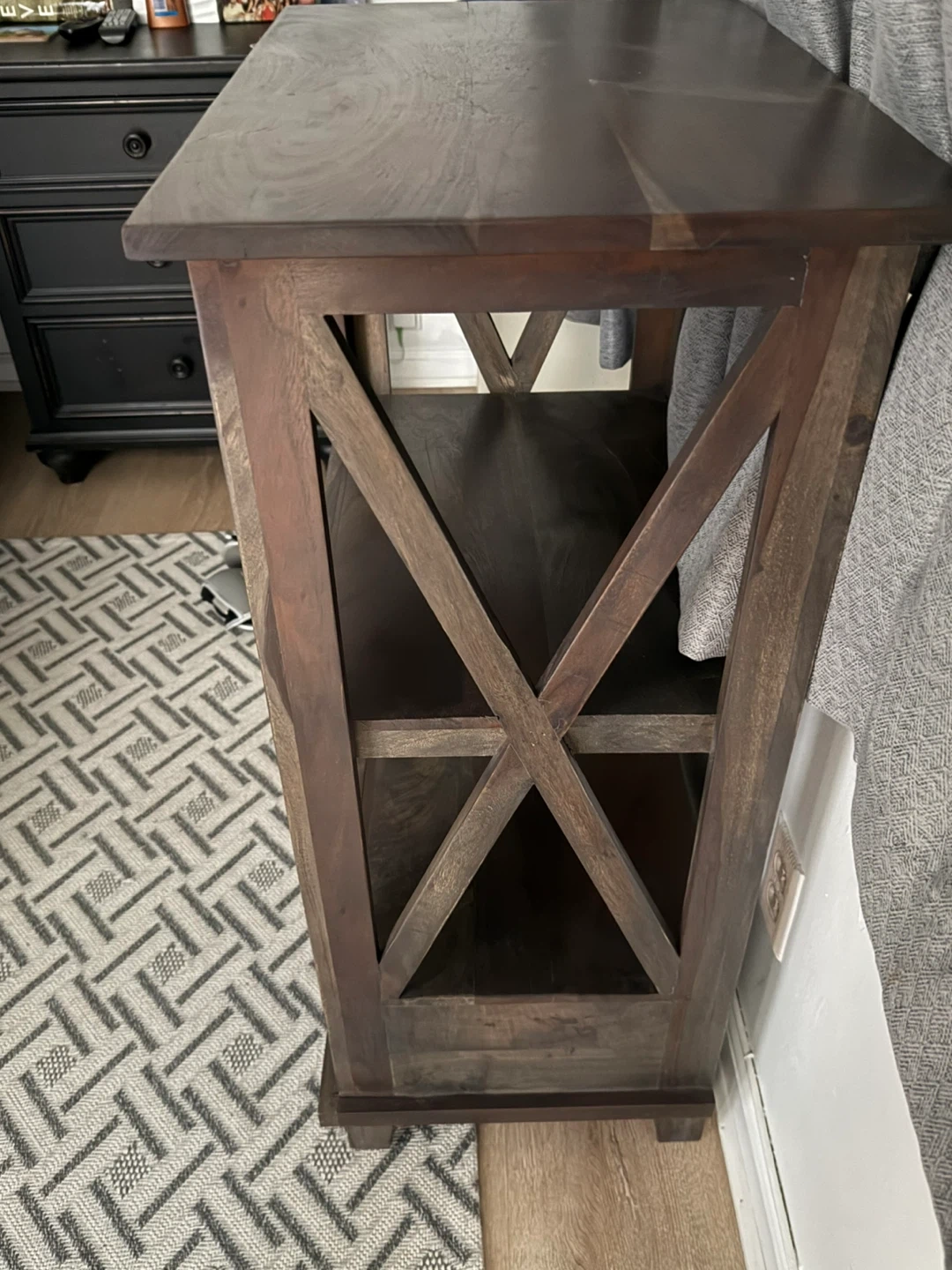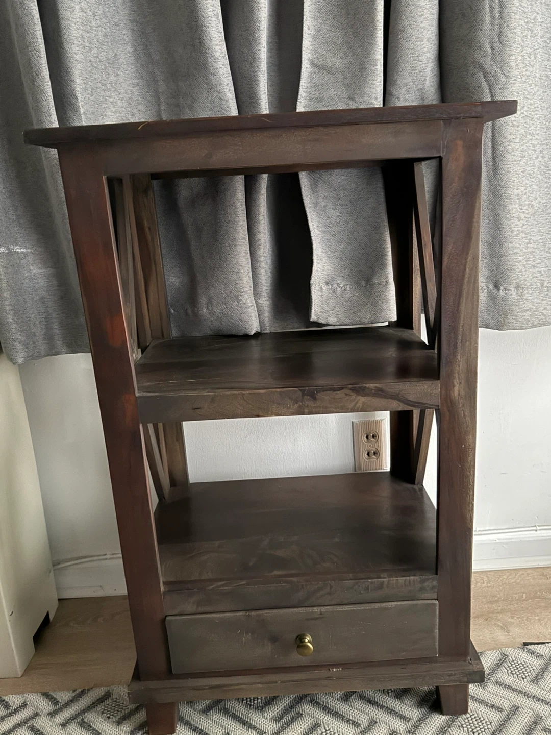 Selling a wooden small book shelf. It has a drawer at the bottom. The wood is a dark brown color. Great for a small space! About 3 feet high 22 in X 15 inches.